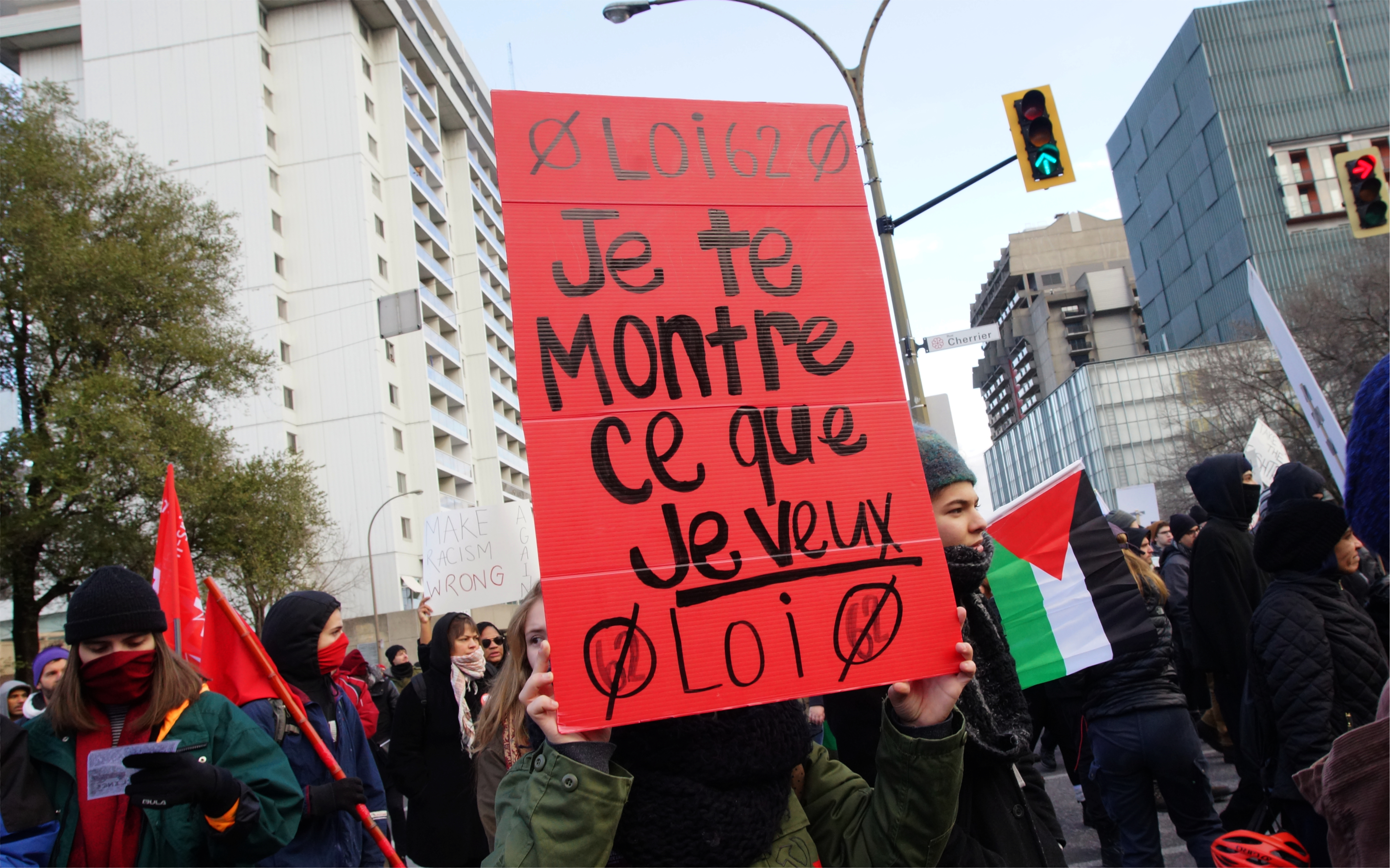 Des centaines de personnes ont manifesté au centre-ville de Montréal, dimanche après-midi, pour dénoncer l’extrême-droite, le racisme et la loi sur la neutralité religieuse du gouvernement québécois, qui force les femmes voilées à se découvrir le visage pour donner ou recevoir des services publics.