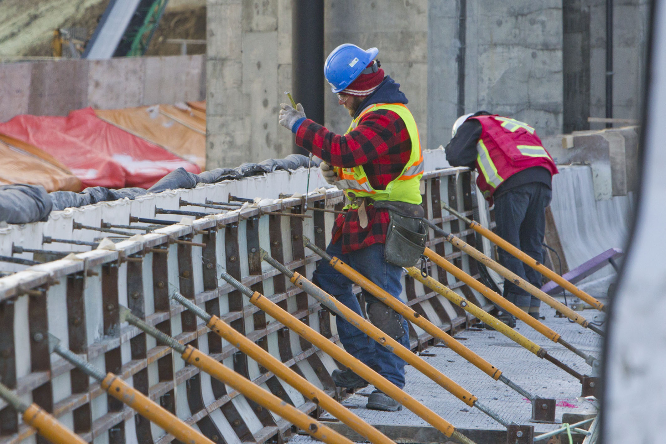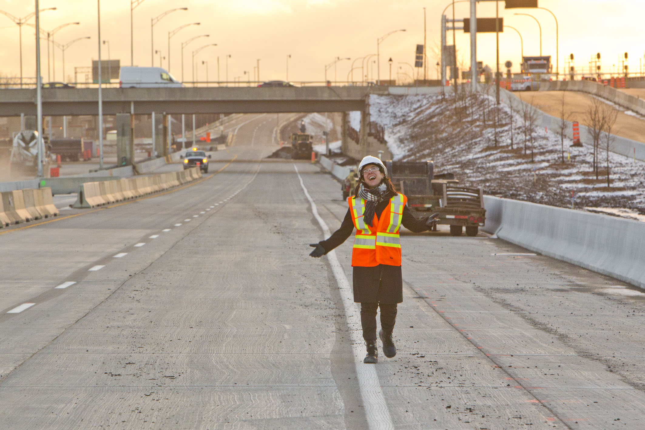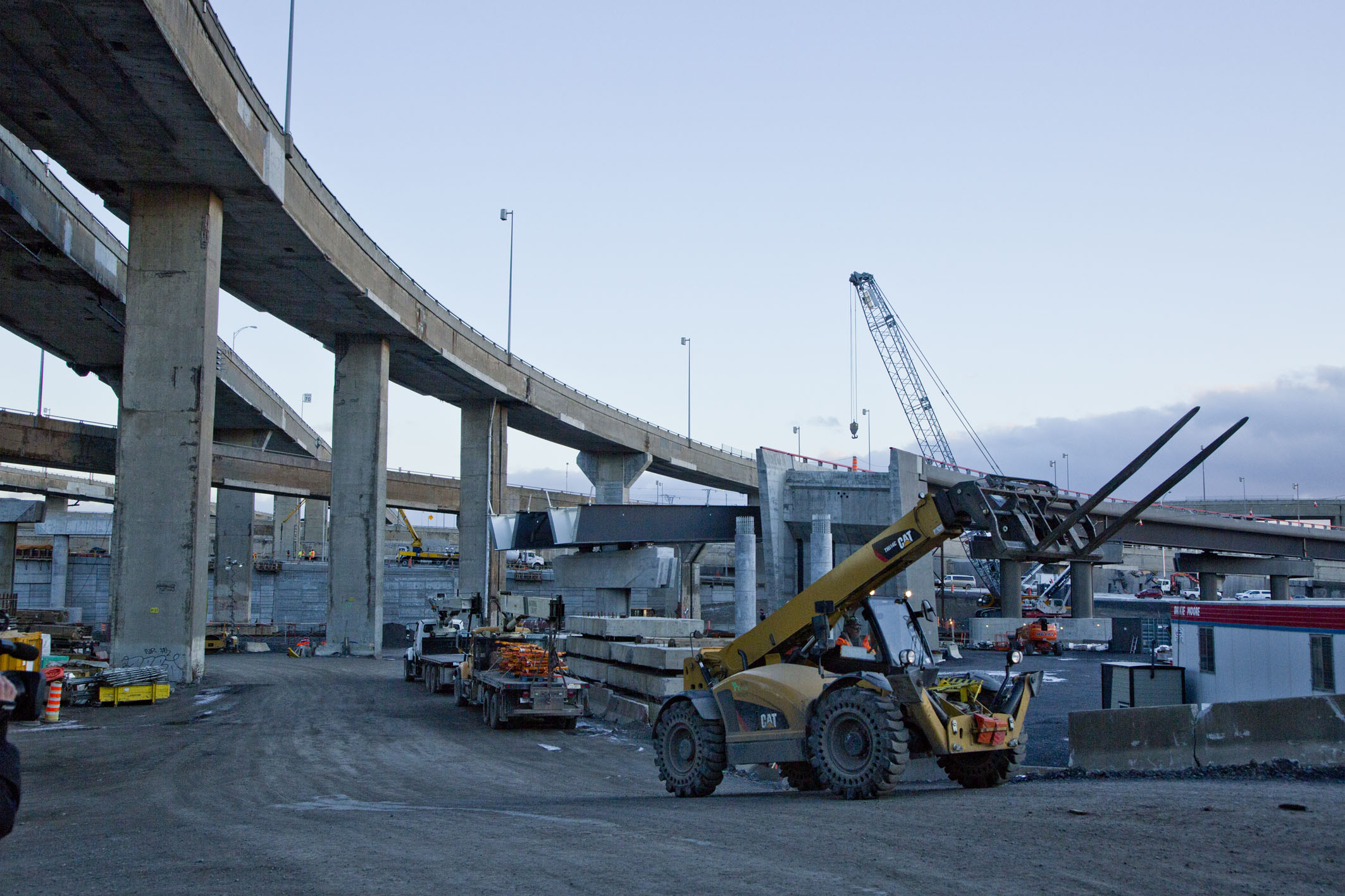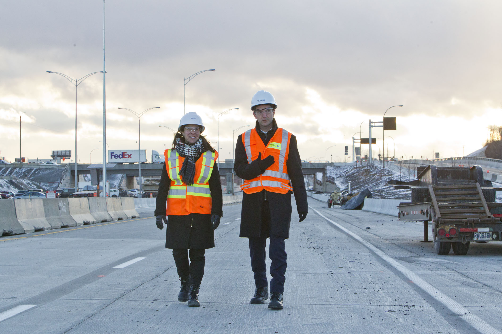 Se frayant un chemin sur la route de gravier, l’autobus a avancé vers le premier arrêt du tour guidé, la nouvelle bretelle permanente qui permettra aux automobilistes en provenance du centre-ville de se diriger vers l’A15 Sud. Des dizaines d’ouvriers s’affairaient à monter des segments de béton sur le nouveau tronçon routier.