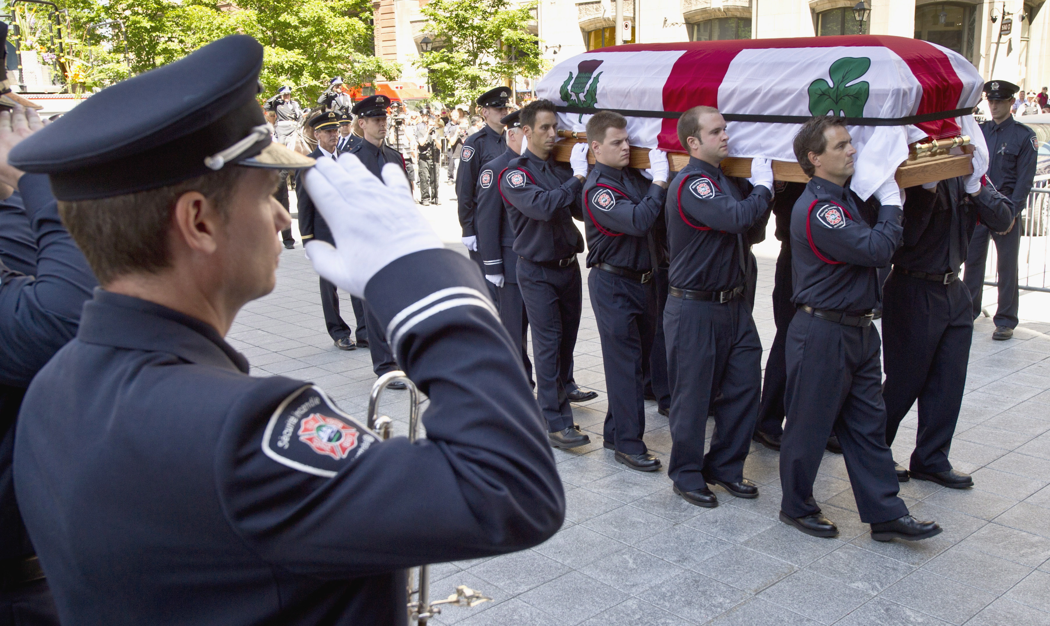 MONTRÉAL – Des milliers de pompiers, principalement de Montréal mais aussi de partout en Amérique du Nord, ont rendu un dernier hommage vendredi à leur collègue Thierry Godfrind à la basilique Notre-Dame de Montréal.