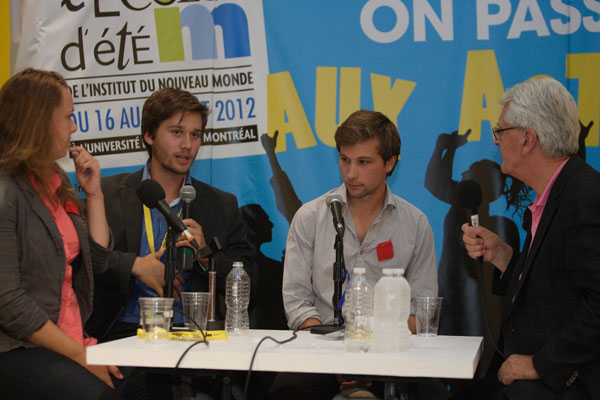 Martine Desjardins, Léo Bureau-Blouin et Gabriel Nadeau-Dubois ont livré des réflexions optimistes sur le conflit étudiant jeudi, lors d’un débat animé par Simon Durivage dans le cadre de l’École d’été de l’Institut du Nouveau Monde.