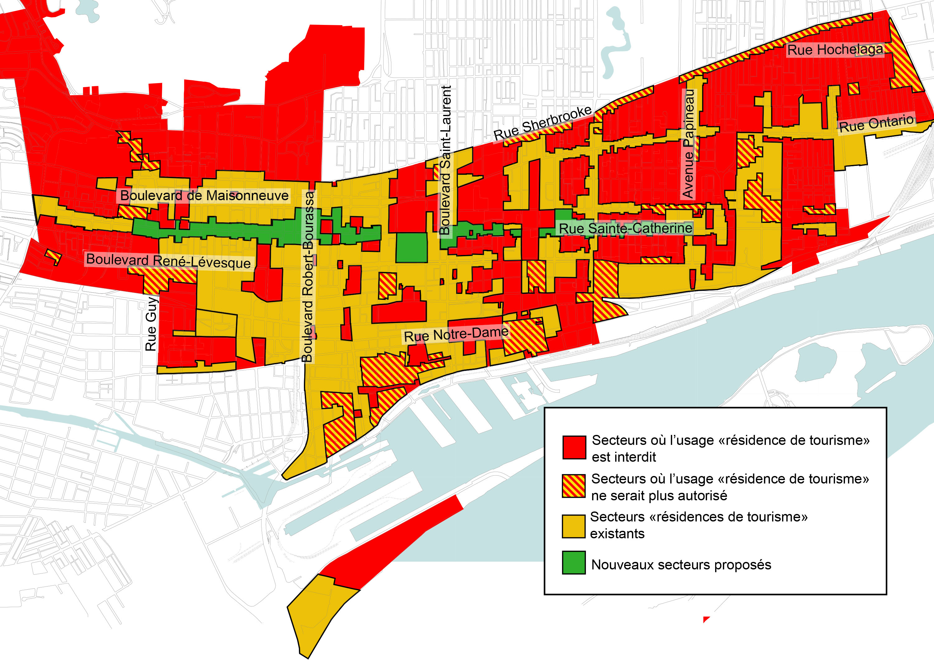 Plusieurs secteurs du centre-ville où il était permis jusqu’à maintenant de mettre son logement sur des plateforme de type Airbnb, moyennant l’octroi d’un permis, ne profiteront plus de ce privilège. Il s’agit notamment de larges sections du Vieux-Montréal et du long de la rue Sherbrooke, entre les rues Frontenac et Saint-Denis.