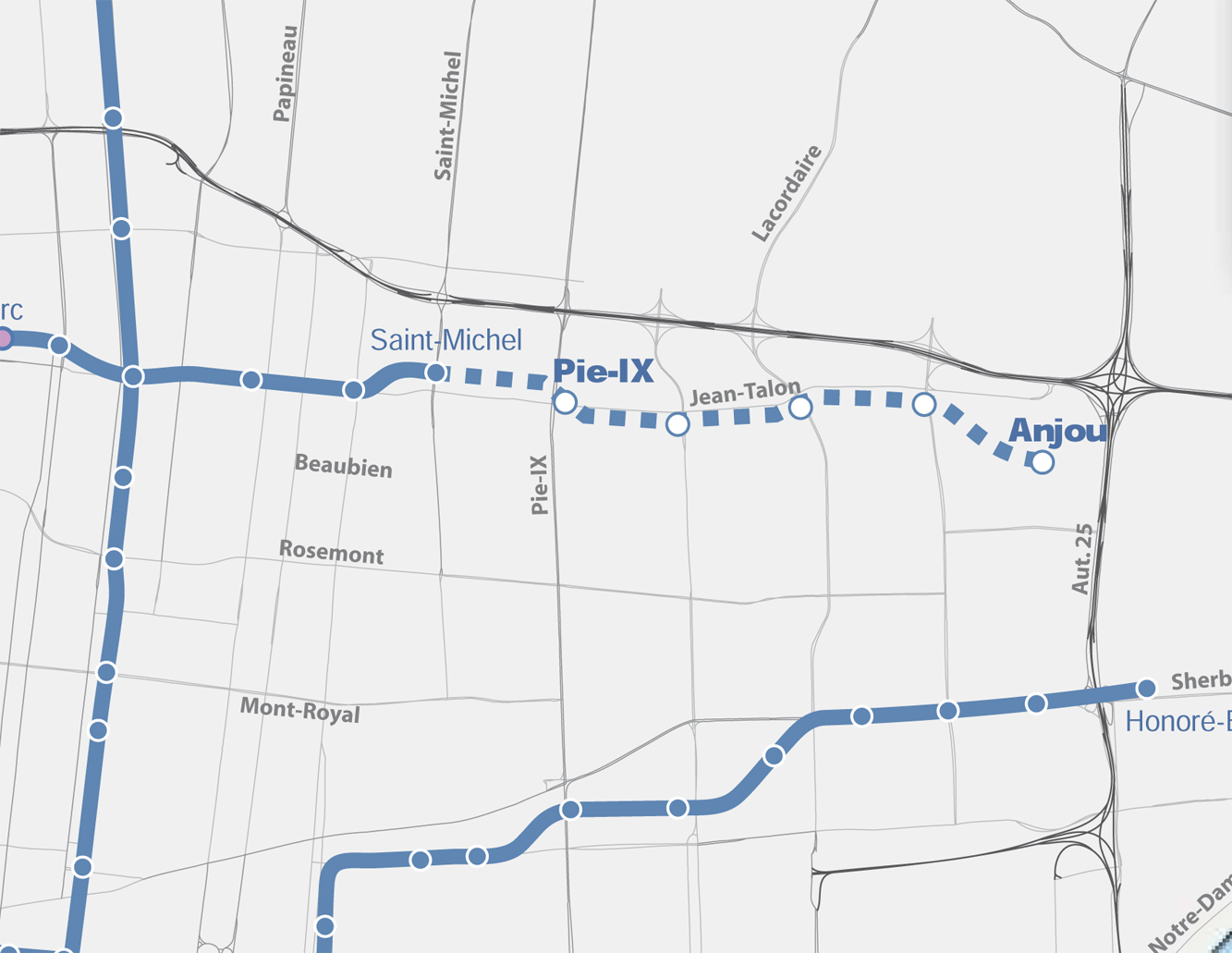 Parmi les aspects techniques, le prolongement vers Anjou compte deux stations intermodales (contre une seule à Laval), plus d’édicules secondaires (+93M$), un garage plus grand (+257M$), un centre d’attachement des trains qui n’était pas nécessaire à Laval (+112M$) et des contraintes techniques liées aux travaux en milieu urbain (+89M$).