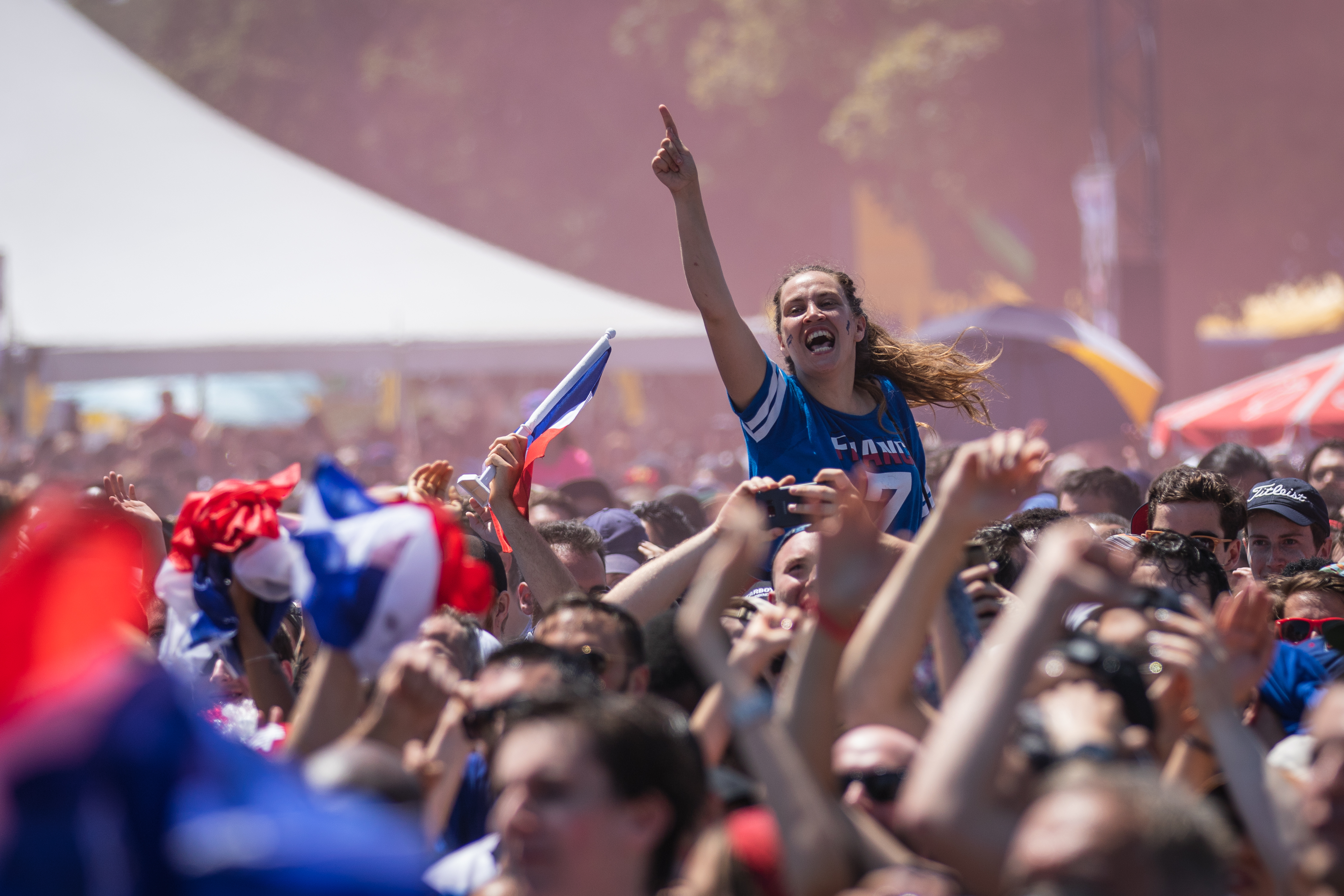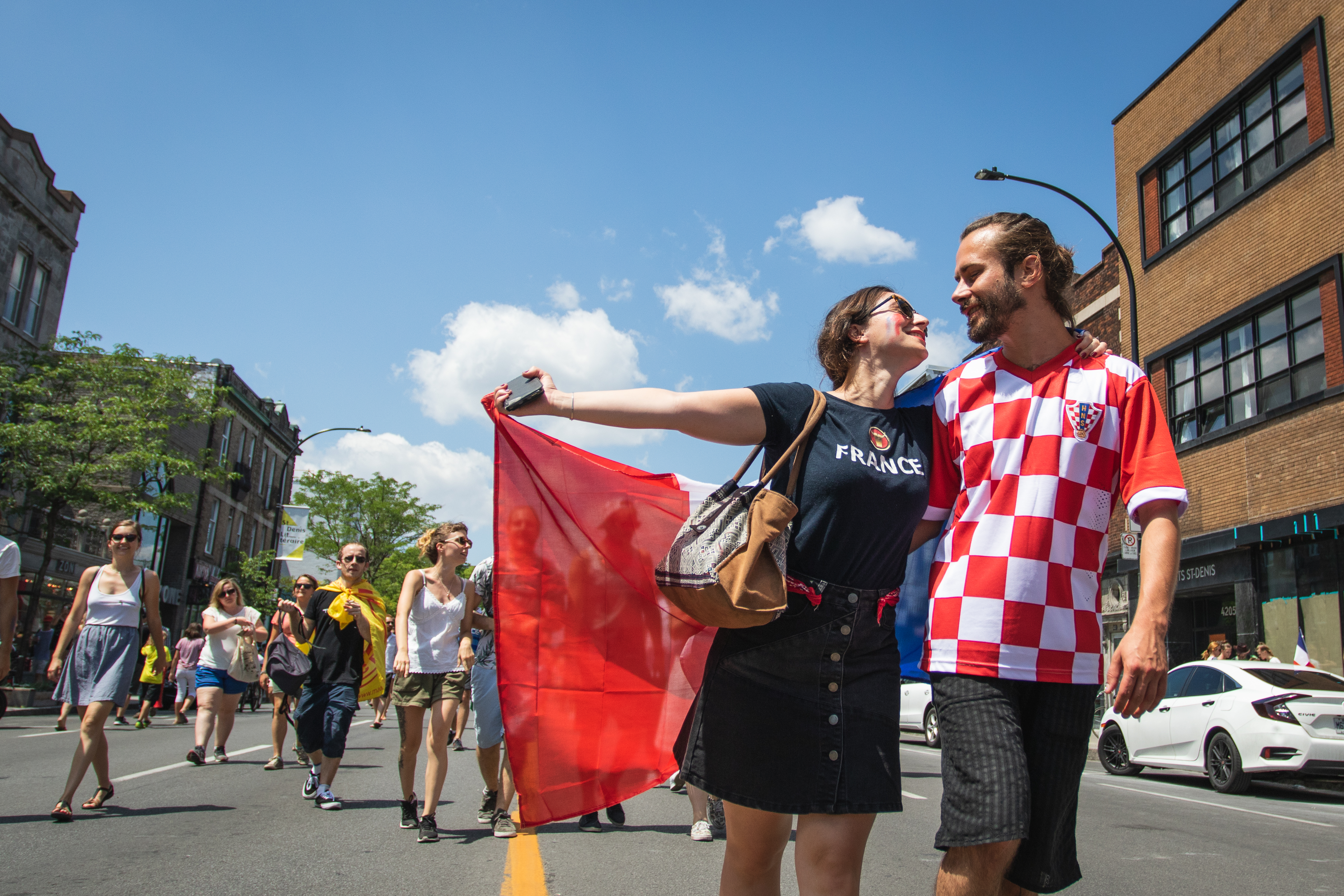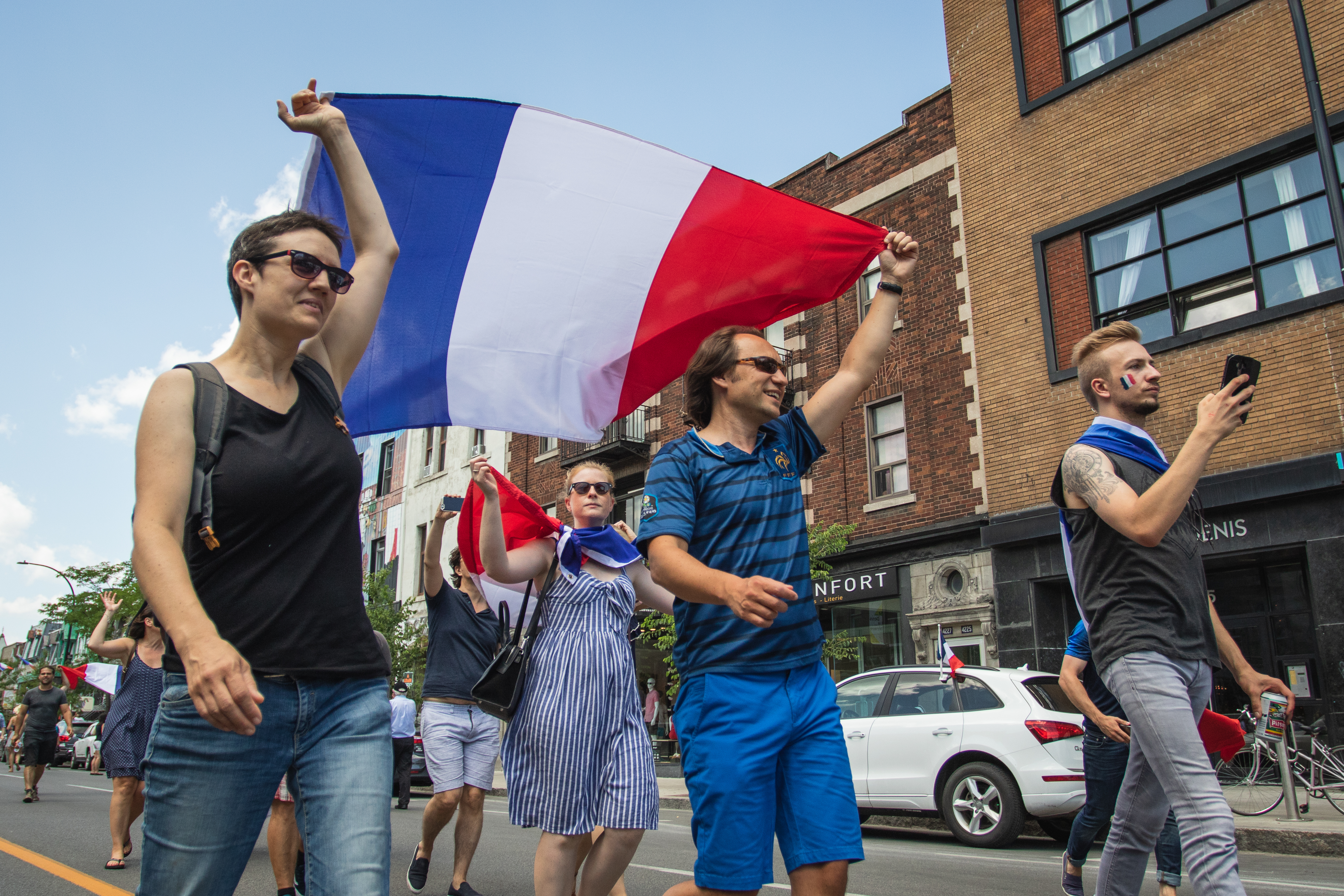 Des fumigènes colorent l’atmosphère en bleu, blanc et rouge, alors que le soleil cogne de toutes ses forces sur une foule rassemblée par ce sacre mondial, après un match haletant contre la Croatie (4-2). «On est les champions, on est les champions, on est, on est, on est les champions!» chantent en chœur les milliers de Français à l’angle des rues Rachel et Saint-Denis, pendant que plusieurs font exploser des bouteilles de champagne ou de bières. Tous l’ont, l’ivresse de la victoire, en entonnant une Marseillaise qu’ils répéteront inlassablement au cours de cette chaude après-midi de juillet.