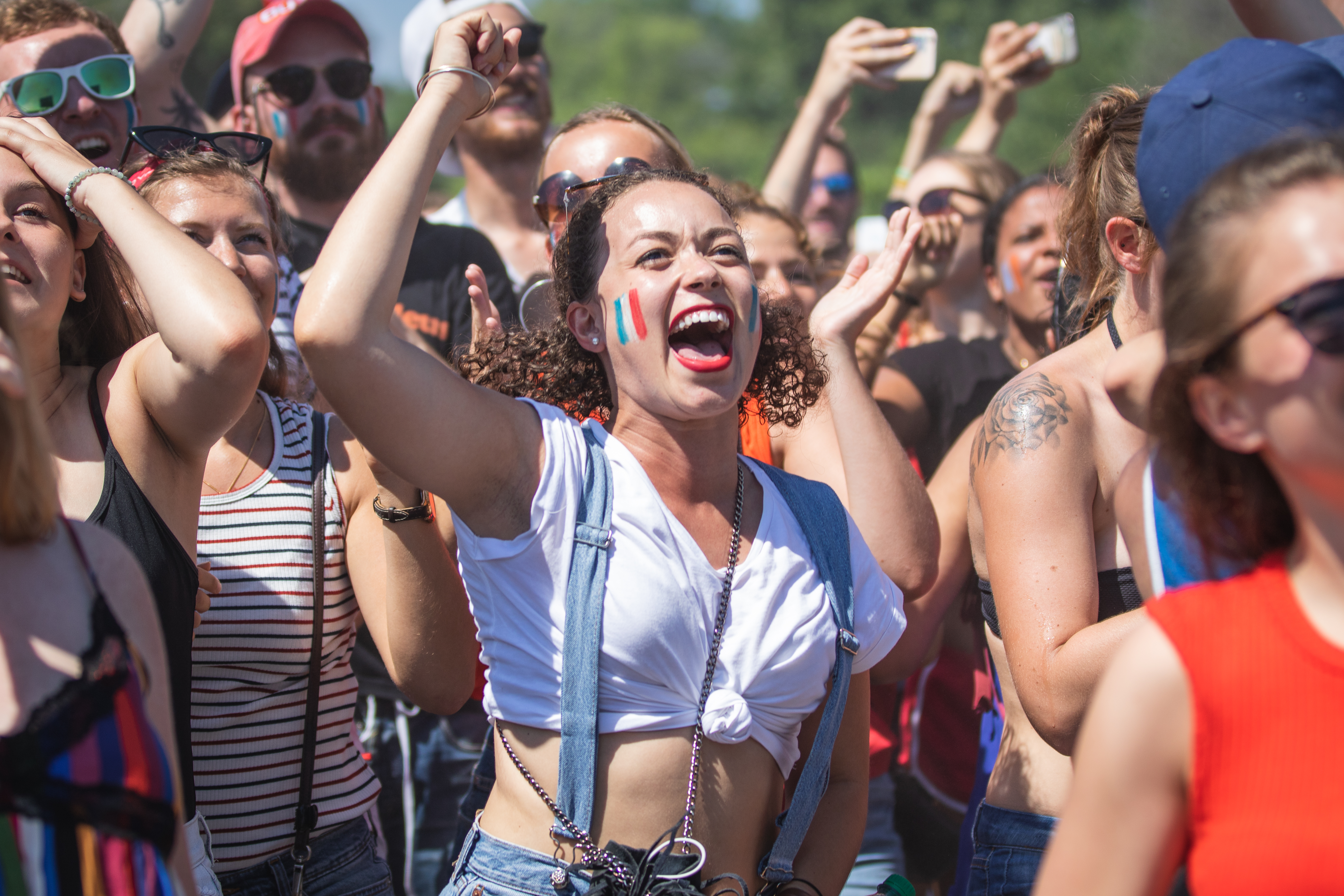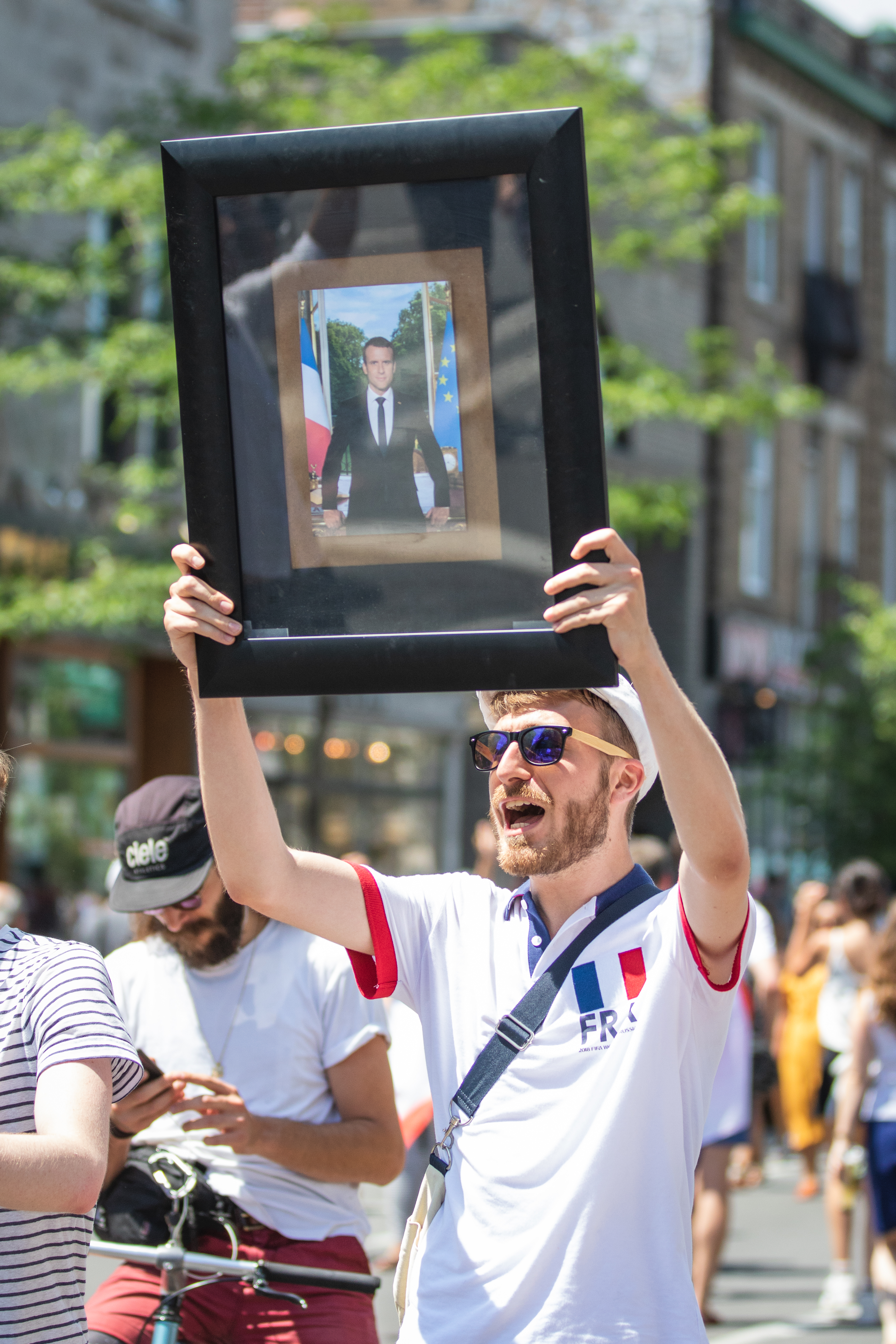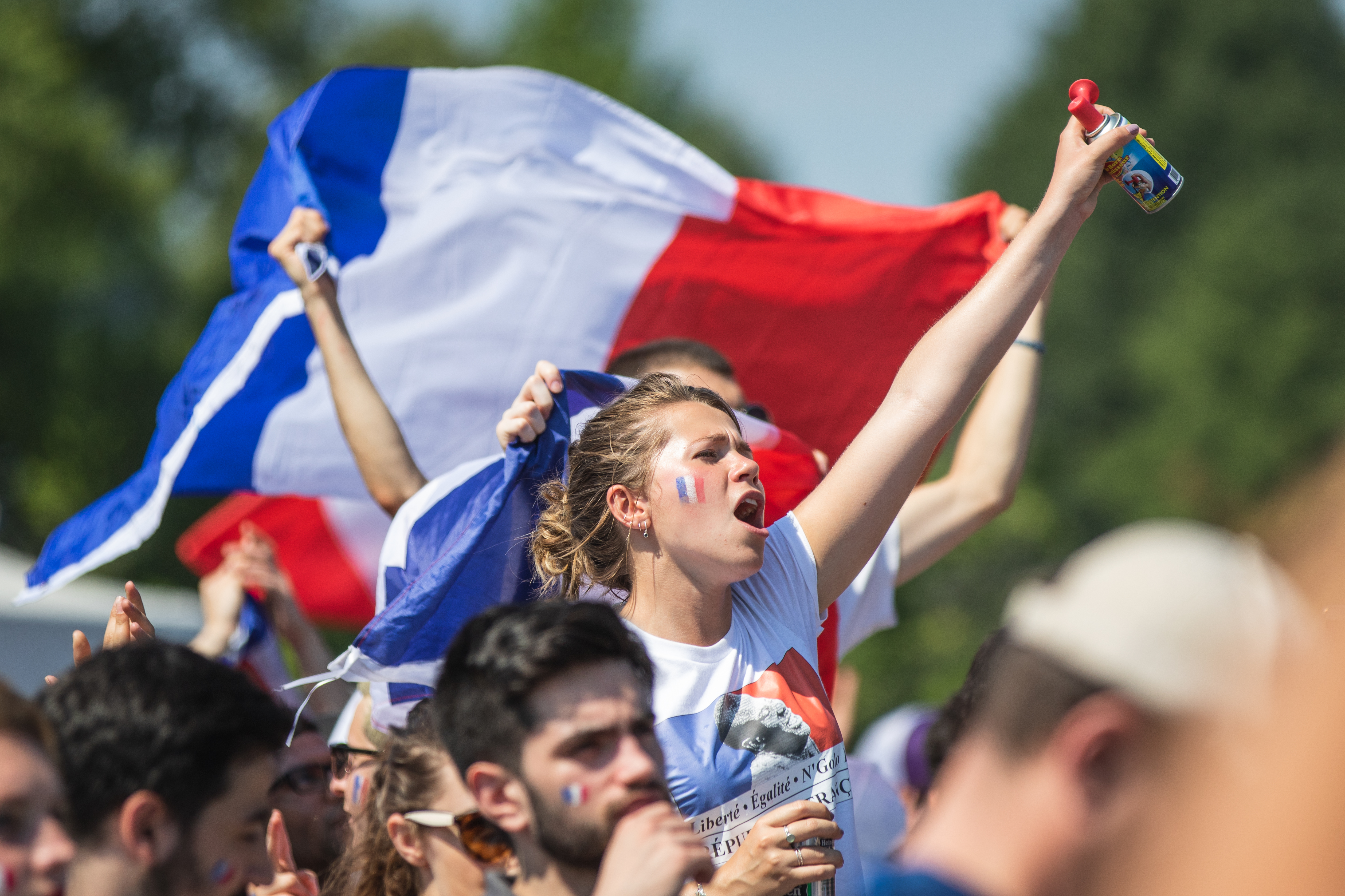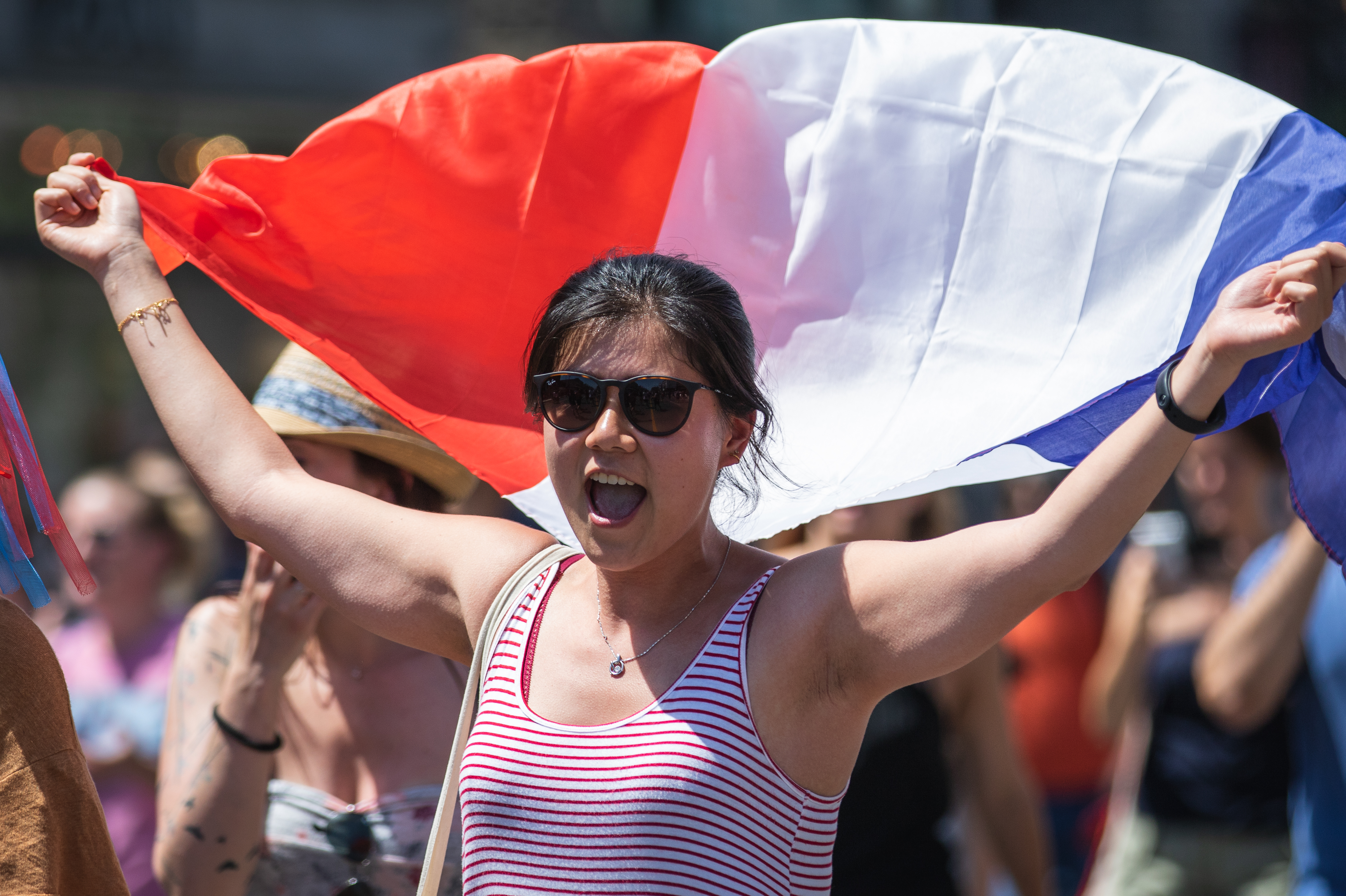 Des fumigènes colorent l’atmosphère en bleu, blanc et rouge, alors que le soleil cogne de toutes ses forces sur une foule rassemblée par ce sacre mondial, après un match haletant contre la Croatie (4-2). «On est les champions, on est les champions, on est, on est, on est les champions!» chantent en chœur les milliers de Français à l’angle des rues Rachel et Saint-Denis, pendant que plusieurs font exploser des bouteilles de champagne ou de bières. Tous l’ont, l’ivresse de la victoire, en entonnant une Marseillaise qu’ils répéteront inlassablement au cours de cette chaude après-midi de juillet.