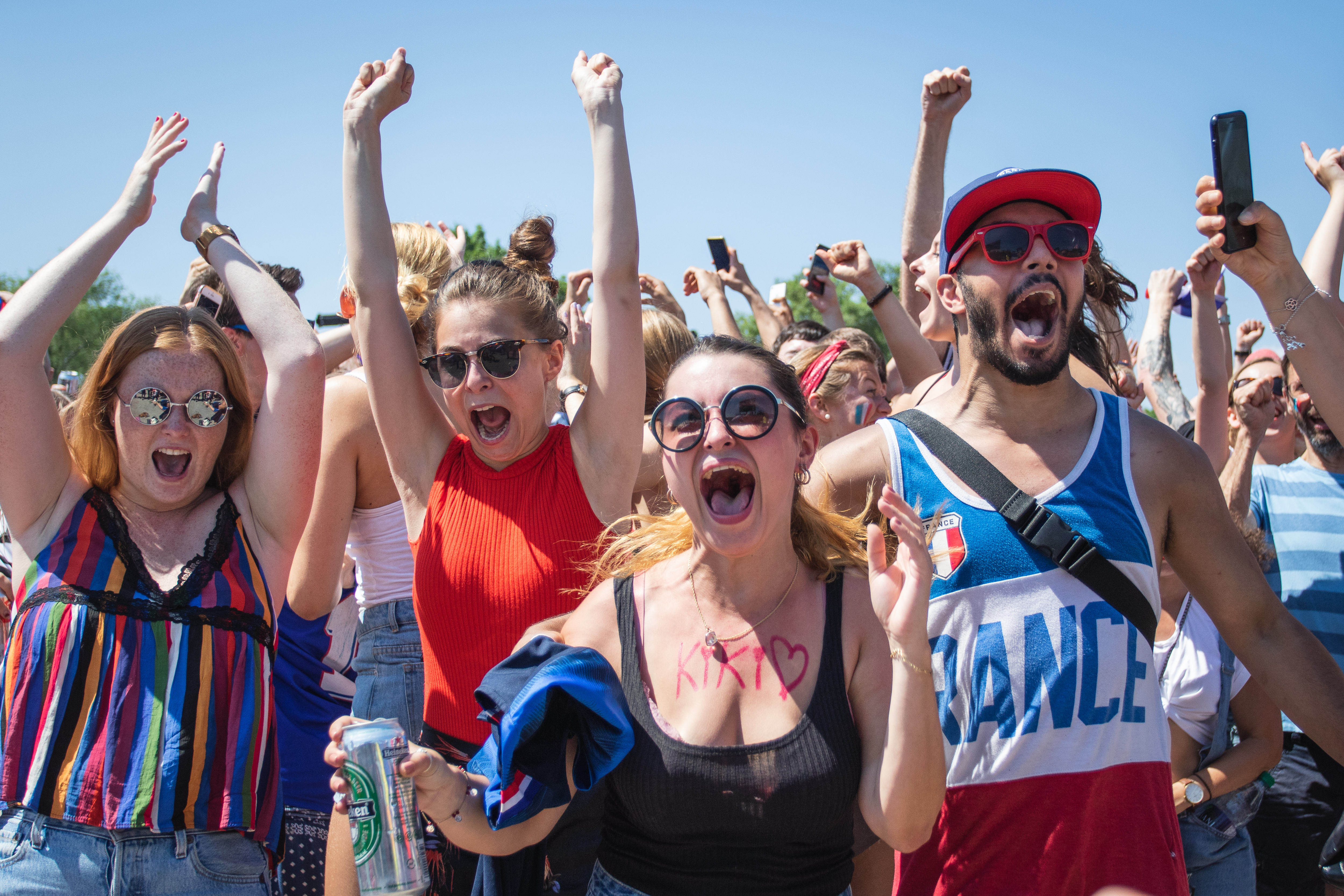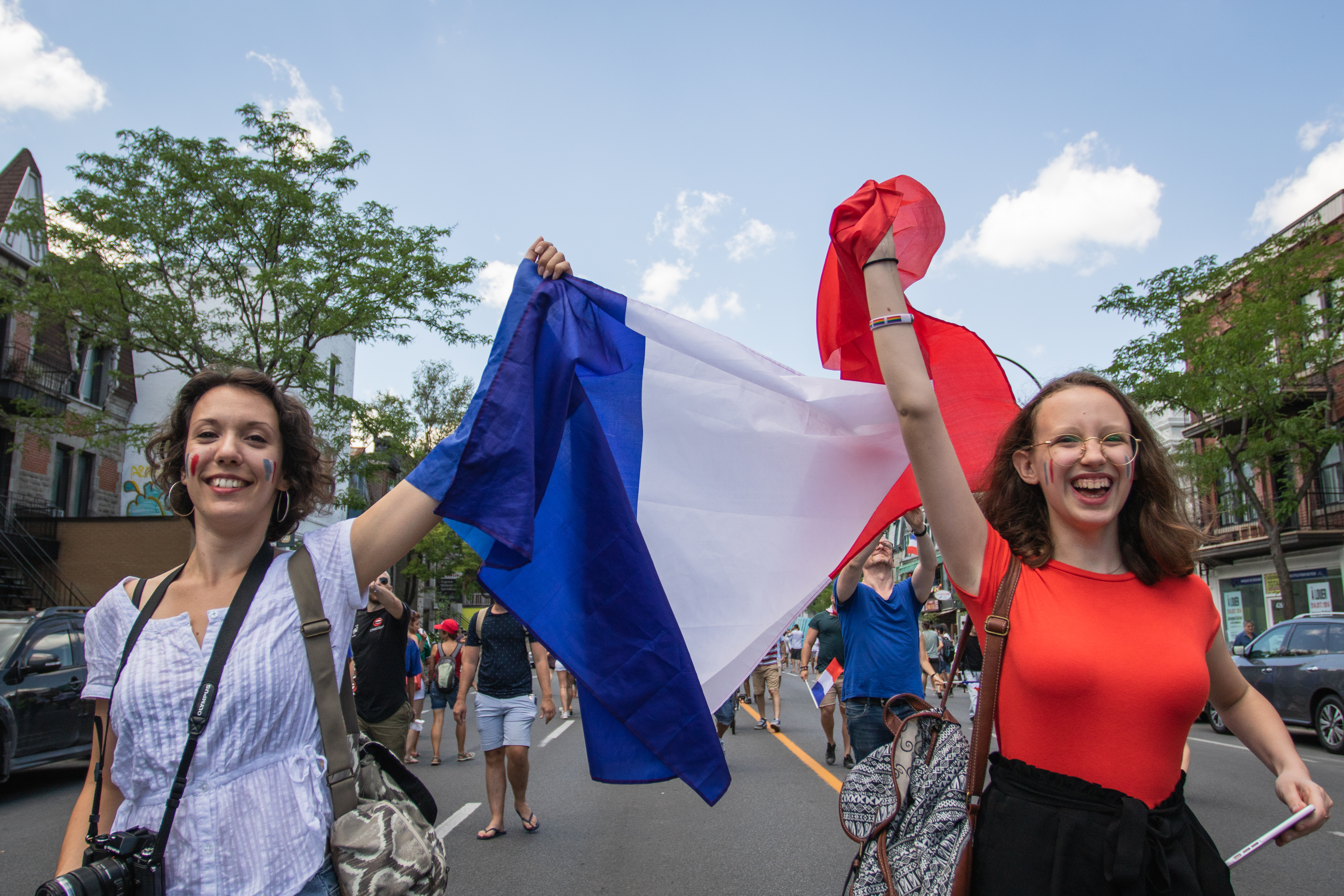 Des fumigènes colorent l’atmosphère en bleu, blanc et rouge, alors que le soleil cogne de toutes ses forces sur une foule rassemblée par ce sacre mondial, après un match haletant contre la Croatie (4-2). «On est les champions, on est les champions, on est, on est, on est les champions!» chantent en chœur les milliers de Français à l’angle des rues Rachel et Saint-Denis, pendant que plusieurs font exploser des bouteilles de champagne ou de bières. Tous l’ont, l’ivresse de la victoire, en entonnant une Marseillaise qu’ils répéteront inlassablement au cours de cette chaude après-midi de juillet.