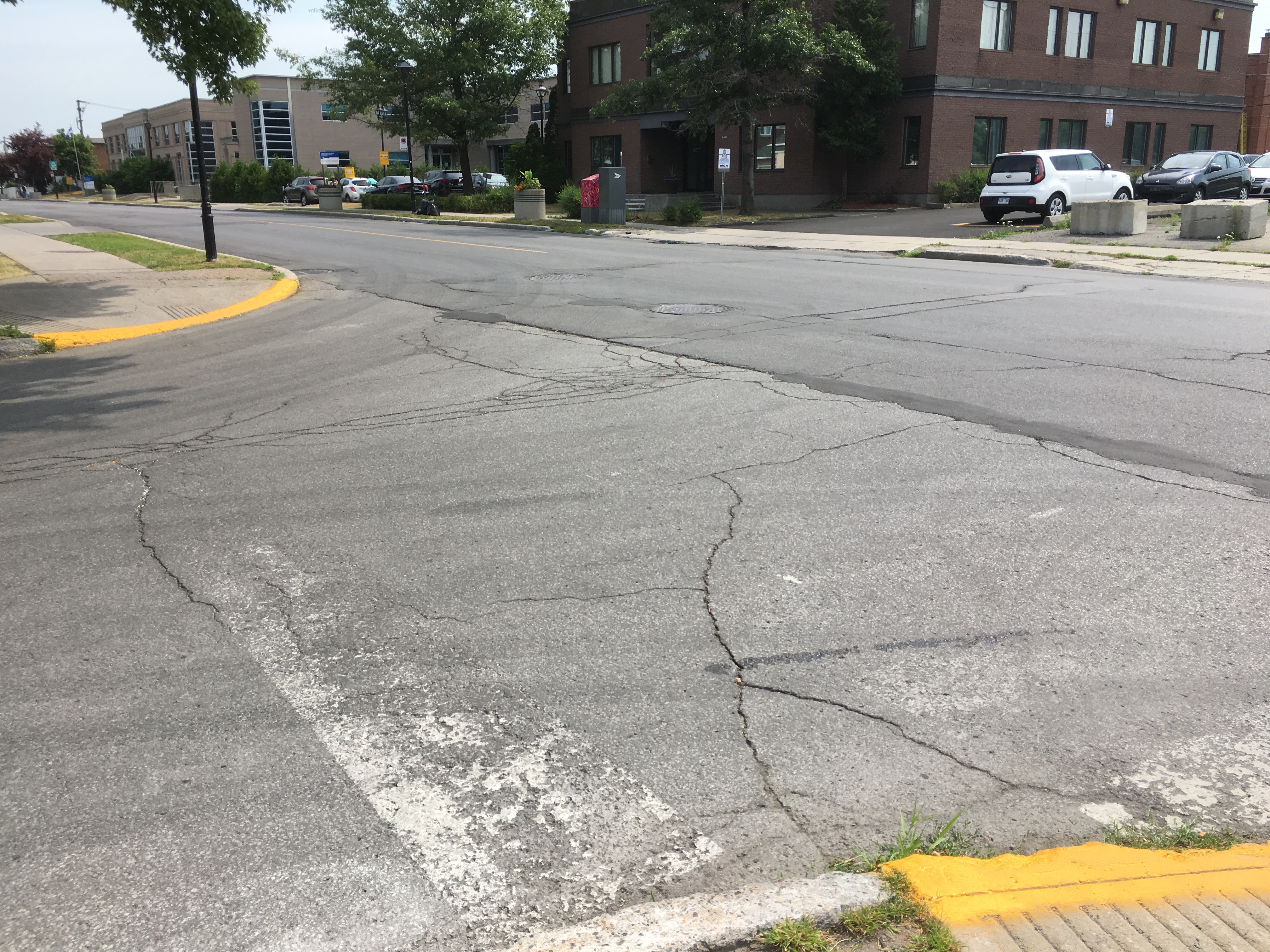 À l’intersection du boulevard Viau et de la rue Jean-Talon, on peut également apercevoir des traverses piétonnes presque totalement effacées, il en va de même à proximité du Centre Ferland et pour d’autres corridors scolaires.