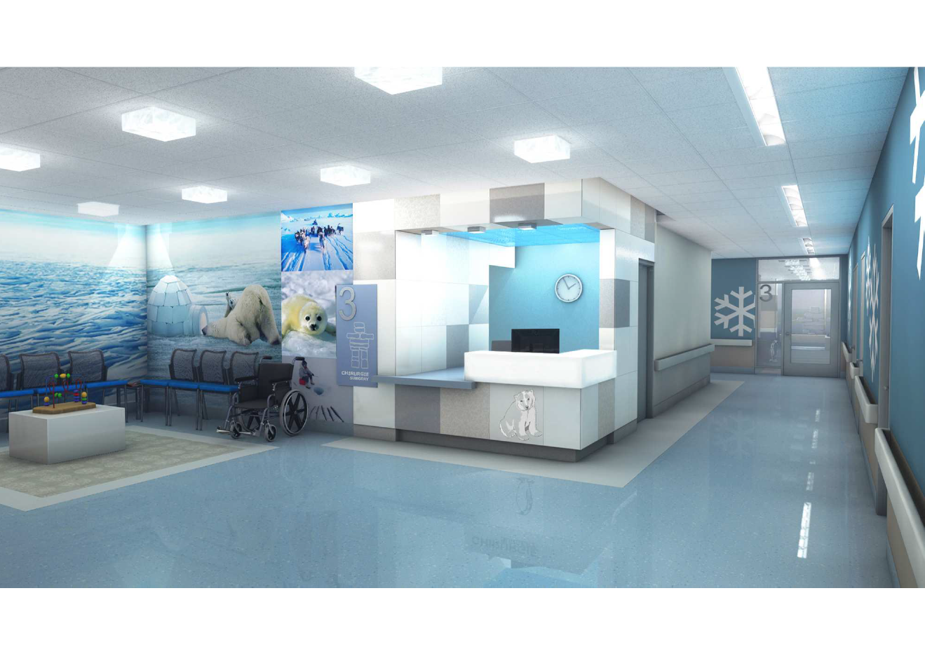 Par exemple, le troisième étage, où se trouvera le bloc opératoire, aura pour thème le Grand Nord. De la neige et des glaces décoreront les murs pour leur effet calme et apaisant sur les enfants a fait savoir Mme Doray.