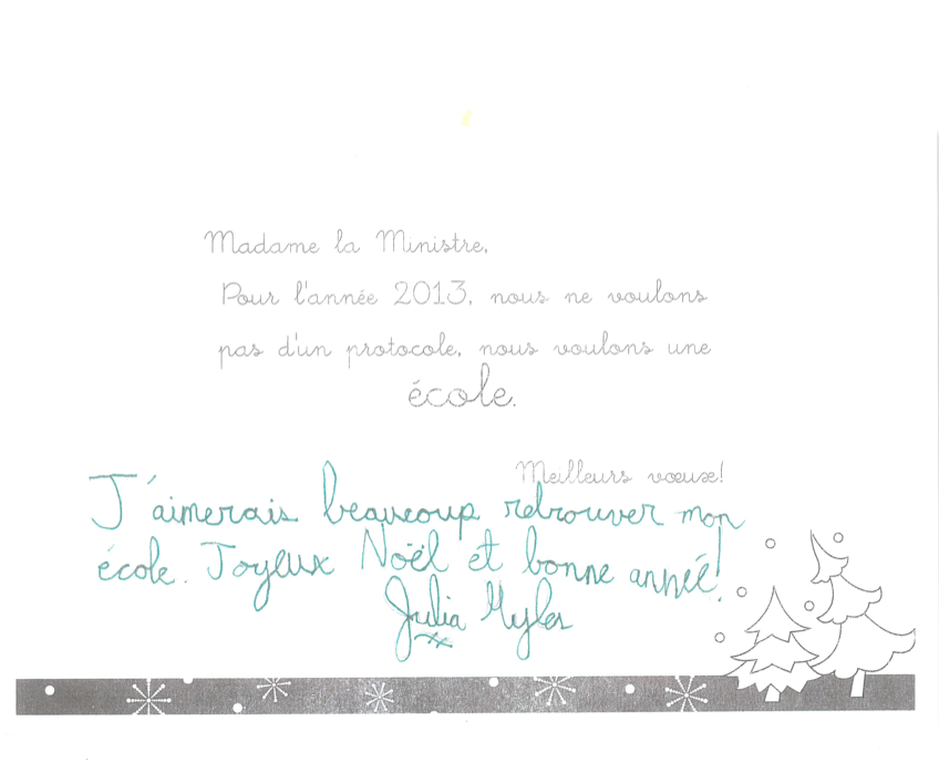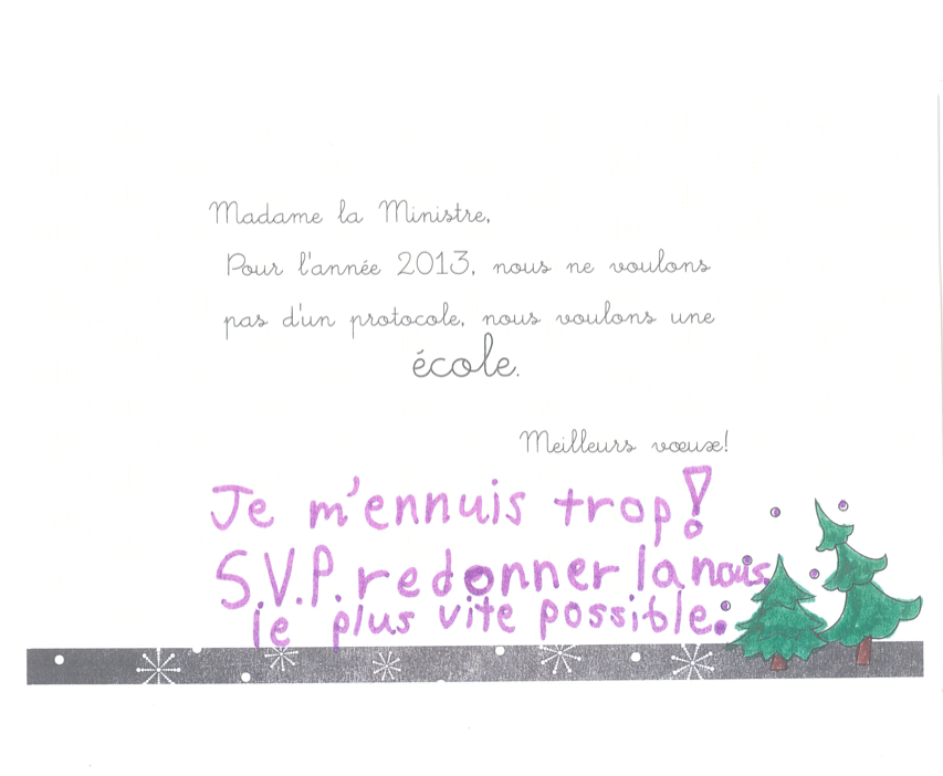 Le Regroupement de parents de l’école Saint-Gérard (RPSG) et des élèves sont allés remettre près de 350 cartes de vœux à la ministre de l’Éducation, Marie Malavoy, lundi,pour lui signifier leur souhait pour 2013 : une nouvelle école.