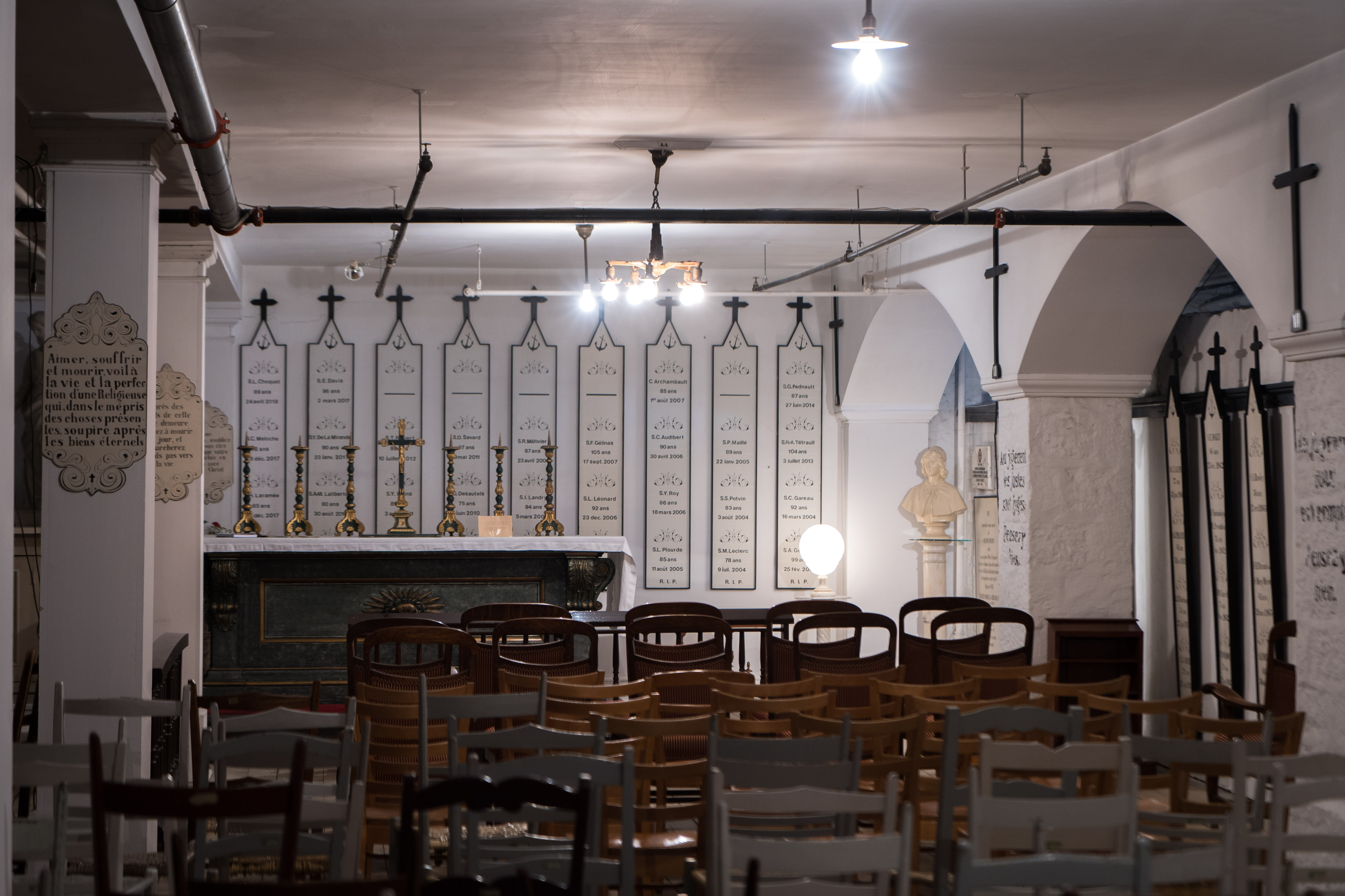 À première vue, la crypte des Religieuses Hospitalières de Saint-Joseph, située sous la chapelle de leur couvent de l’avenue des Pins, au pied du mont Royal, frappe par sa grande sobriété. C’est un endroit plutôt sombre, avec des tuyaux qui courent le long d’un plafond très bas, où le principal son qui arrive à vos oreilles est celui de la chaufferie toute proche.