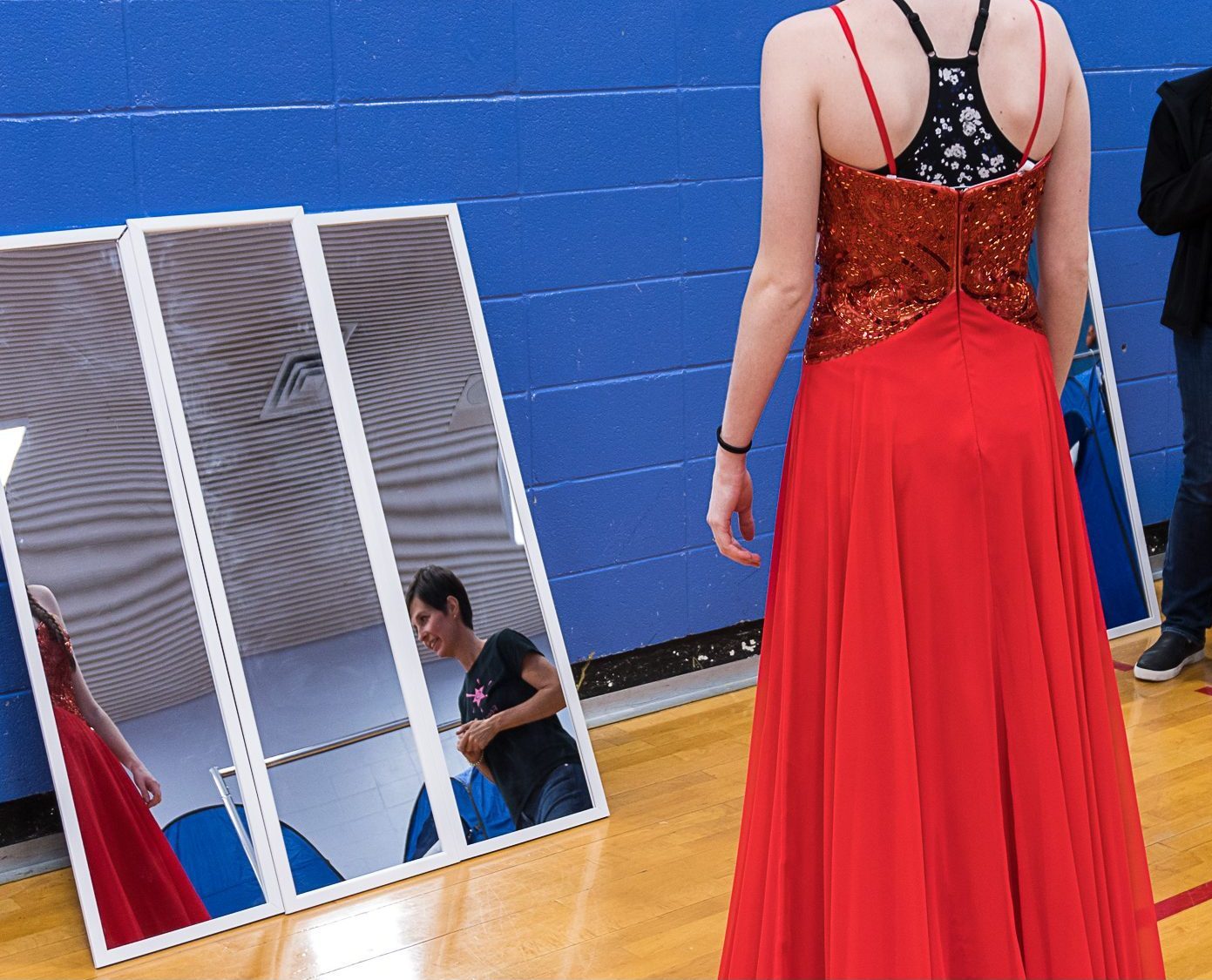 Après un moment, elle en sélectionne quatre, qu’elle essayera afin de déterminer celle qu’elle préfère. Les bénévoles l’accompagnent alors dans la troisième partie du gymnase, où une soixantaine de tentes sont dressées afin de faire office de cabine d’essayage. Très vite, son choix s’arrête. Ses yeux s’émeuvent alors qu’elle s’admire devant un miroir. À côté d’elle, les bénévoles s’extasient : la robe lui va comme un gant. Une couturière prendra ensuite ses mesures afin d’y mettre les derniers ajustements.