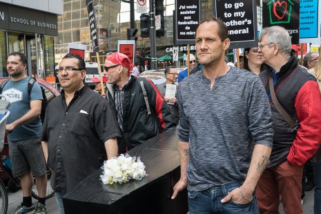 Après avoir vu des centaines de personnes défiler dans leur bureau, les organisatrices communautaires du Projet Genèse, basé dans Côte-des-Neiges, ont eu l’idée d’organiser cette marche sous des allures de cortège funèbre, au terme duquel les manifestants sont allés déposer, devant les bureaux montréalais du premier ministre, un cercueil rempli de témoignages.
