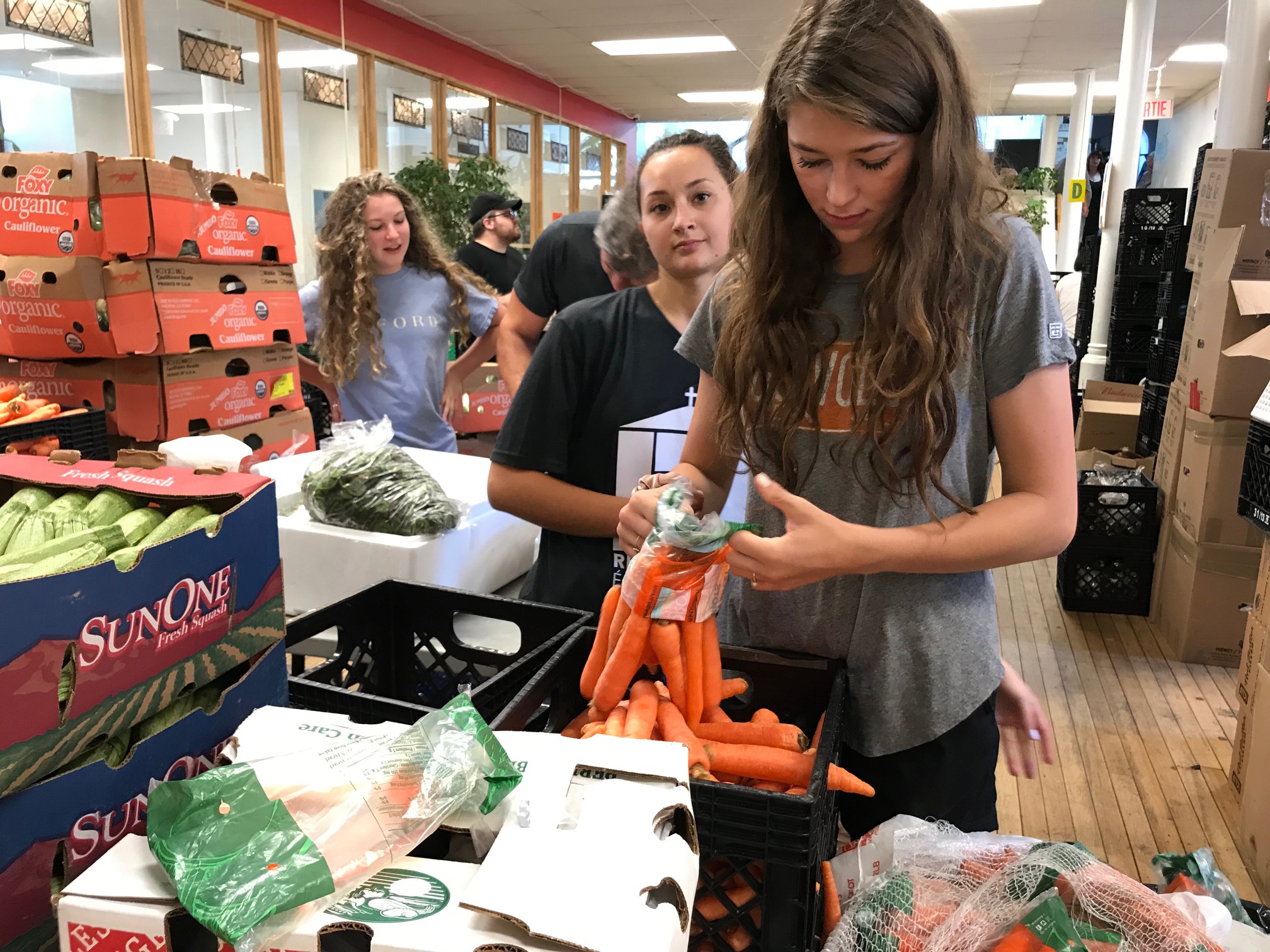 Au premier étage, une dizaine de résidents du quartier sirotaient un café attendant d’avoir accès à un panier alimentaire. Juste en bas, des étudiants et adultes s’affairaient à emballer salades et carottes fraîches. Derrière eux, d’énormes boîtes de carton abritent des conserves dont des boîtes de thon, riz.