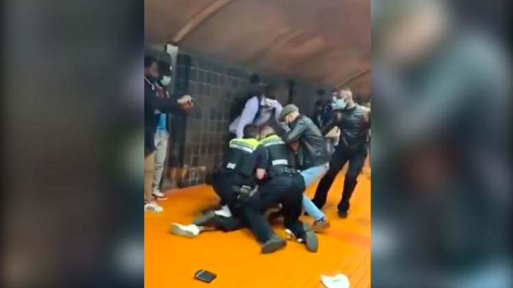 Dans une vidéo diffusée sur Twitter, on peut voir deux agents de la Société de transport de Montréal (STM) tenter de maîtriser au sol une femme noire qui résiste à l’arrestation.