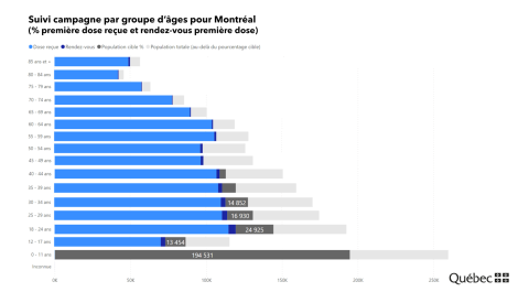 Dans les prochains jours il faudra «mettre l’emphase sur la vaccination des 12 à 45 ans et donner un coup de barre pour la vaccination des 21 à 35 ans.» Au total, dans la métropole, c’est 90 000 montréalais qui doivent encore être vaccinés avec une première dose afin d’atteindre l’objectif de vaccination de seuil vaccinal.