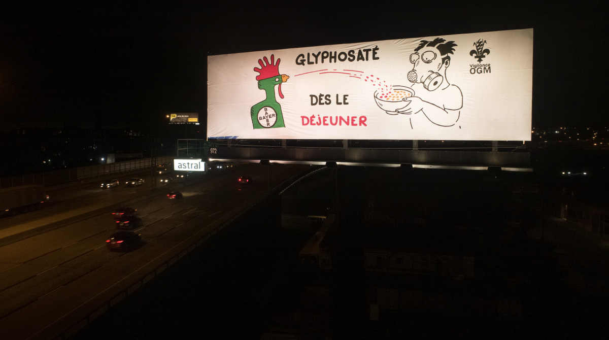 Les automobilistes ont pu l’apercevoir tôt ce matin près de l’échangeur Turcot à Montréal, une bannière géante dénonçant l’utilisation excessive du glyphosate a été déployée ce matin par Vigilance OGM.