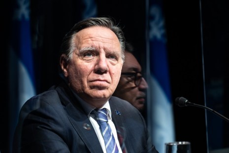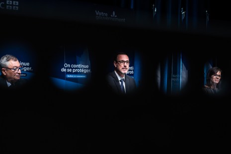 Pendant une conférence de presse du Premier ministre du Québec, François Legault, le 8 avril, le reflet du directeur national de santé publique, Dr Horacio Arruda, apparaît dans un plexiglass les séparant.