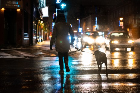 Une femme promène son chien pendant le couvre-feu, le 11 janvier 2021.