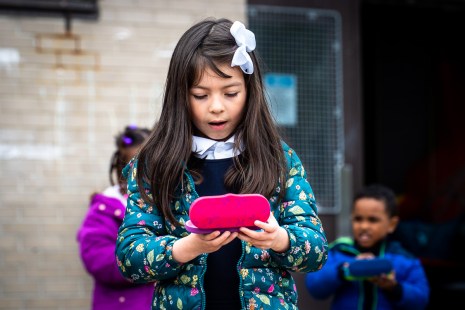Des élèves de maternelle de l’école Sainte-Colette ont reçu de nouvelles lunettes gratuitement. Une initiative de l’école et d’une mère, en collaboration avec un centre d’optométrie, le 12 mai 2021.