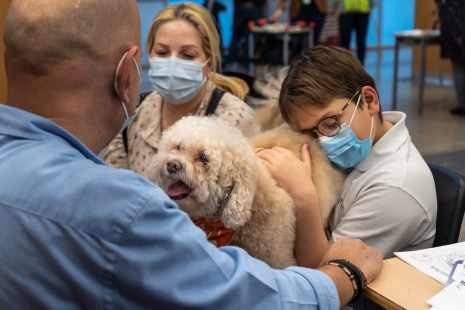 Victor, 10 ans, se fait rassurer par Bémol le chien lors de la première journée de vaccination des enfants de 5 à 11 ans contre la COVID-19 au Palais des Congrès, le 24 novembre 2021.