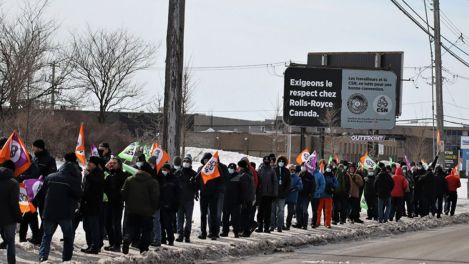 Les travailleurs de chez Rolls-Royce Canada ont protesté en solidarité devant leur usine à Lachine pour de meilleures conditions de travail. Un vote de grève est prévu pour le 15 mars prochain.