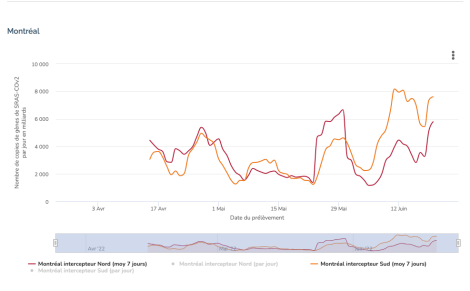 Selon les données de l’Institut national de santé publique du Québec (INSPQ) issues de la vigie de la COVID-19 dans les eaux usées, les concentrations du virus seraient en hausse dans les égouts de Montréal et de Laval. Un nouveau pic se profile avec près de 13 390 milliards de particules de virus détectées à Montréal.