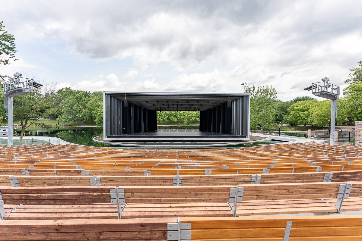 La scène du théâtre constitue un cube sans fond, qui agit comme une fenêtre sur le parc. Il sera donc possible pour les citoyens se trouvant de l’autre côté de l’étendue d’eau de voir partiellement les spectacles. «Le tout a été conçu de manière épurée, pure, sans frivolité.» «L’architecture s’efface pour laisser place à l’art», décrit l’architecte Éric Pelletier de la firme Lemay lors d’une visite réservée aux médias.