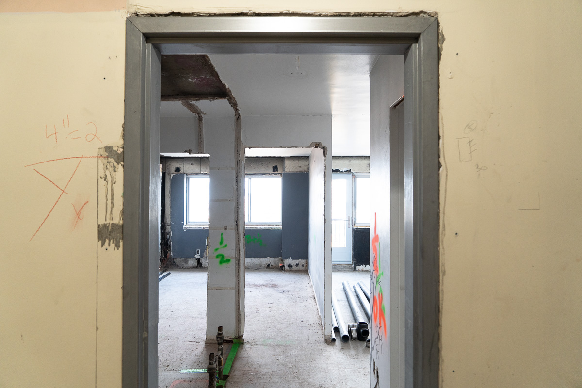 L’humidité s’est engouffrée partout dans le bâtiment, forçant l’entreprise responsable des travaux à installer des souffleurs et chauffages industriels dans toute la hauteur du bâtiment de 16 étages. En se dirigeant vers l’appartement de Vanessa, on traverse un véritable chantier, où les murs des logements vides sont tombés et où l’on constate des infiltrations d’eau. En circulant dans les couloirs, il est facile de trébucher sur un trou dans le sol ou sur des amas de pierres.