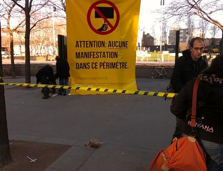 L’espace vert du centre-ville a été délimité par un ruban jaune, comme les périmètres de sécurité qu’érigent les policiers. Sur les affiches, il était entre autres inscrit «les terroristes masqués seront appréhendés», «attention: aucune manifestation dans ce périmètre» ou même «les médias indépendants ne seront pas tolérés».
