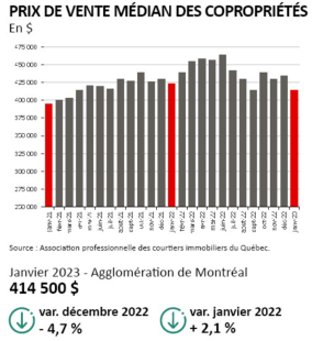 Le prix de vente médian des copropriétés dans l’agglomération de Montréal a enregistré une baisse de 4,7% au mois de janvier, par rapport au dernier mois de l’année 2022.