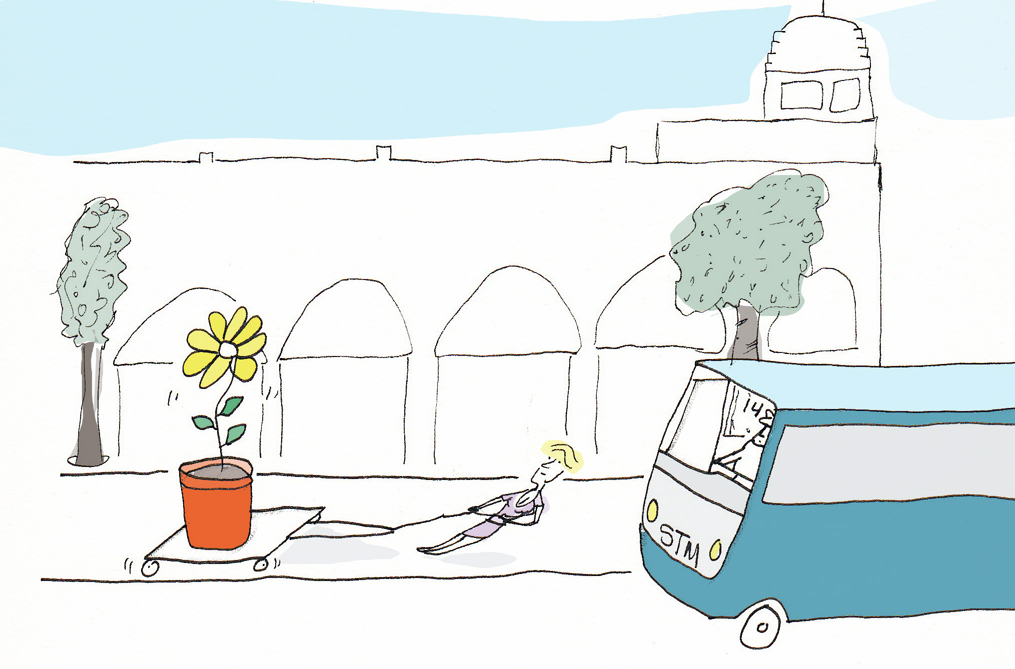 Cet après-midi-là, il fait un temps de printemps qu’on attend tous depuis trop longtemps. L’autobus s’arrête au coin de Amherst et coin Ontario devant le joli marché du même nom. Entre une jeune fille chargée de cageots de fleurs. Pas un, pas deux; au moins une douzaine. Elle pose sa cargaison florale au pied d’une banquette et demande au chauffeur de bien vouloir attendre une minute, le temps qu’elle charge le reste de son jardin en devenir. Quelques sacs de terre, de l’engrais, un arrosoir en plastique vert gazon. Dans un sac de plastique translucide, on devine des gants, un sécateur et une petite pelle.