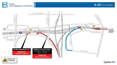 Les travaux de réfection du tunnel Louis-Hippolyte-La Fontaine se poursuivent et entraînent encore une fois des perturbations sur l’autoroute 25 cette fin de semaine. Une entrée et une sortie seront fermées du 2 au 5 juin.
