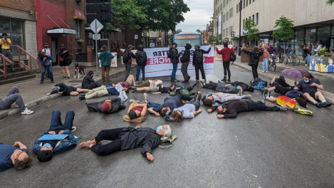 Une cinquantaine de manifestants se sont symboliquement donné la mort devant les bureaux du ministre de l’Environnement, Steven Guilbeault, jeudi après-midi, pour dénoncer l’inaction du gouvernement face à la crise écologique, laquelle est directement liée aux incendies de forêt au Québec. L’événement pouvait facilement être perçu comme une œuvre conceptuelle engagée.