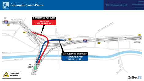 Du 30 juin au 3 juillet, l’échangeur Saint-Pierre, qui relie le pont Honoré-Mercier et l’autoroute 20, sera de nouveau partiellement fermé.