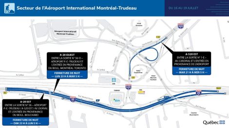 Les automobilistes devront prévoir leurs déplacements dans le secteur de l’aéroport de Montréal en fonction des fermetures de nuit des autoroutes 20 et 520 qui auront lieu du 16 au 19 juillet.