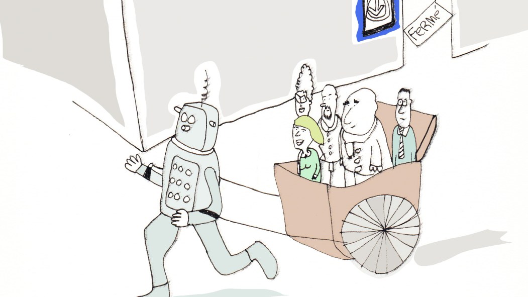 Les portes ne sont pas bloquées par un humain, mais simplement électroniquement détraquées. L’homme qui a chaud, de bonne guerre, le réalise en sortant et en maudissant cette fois les robots.