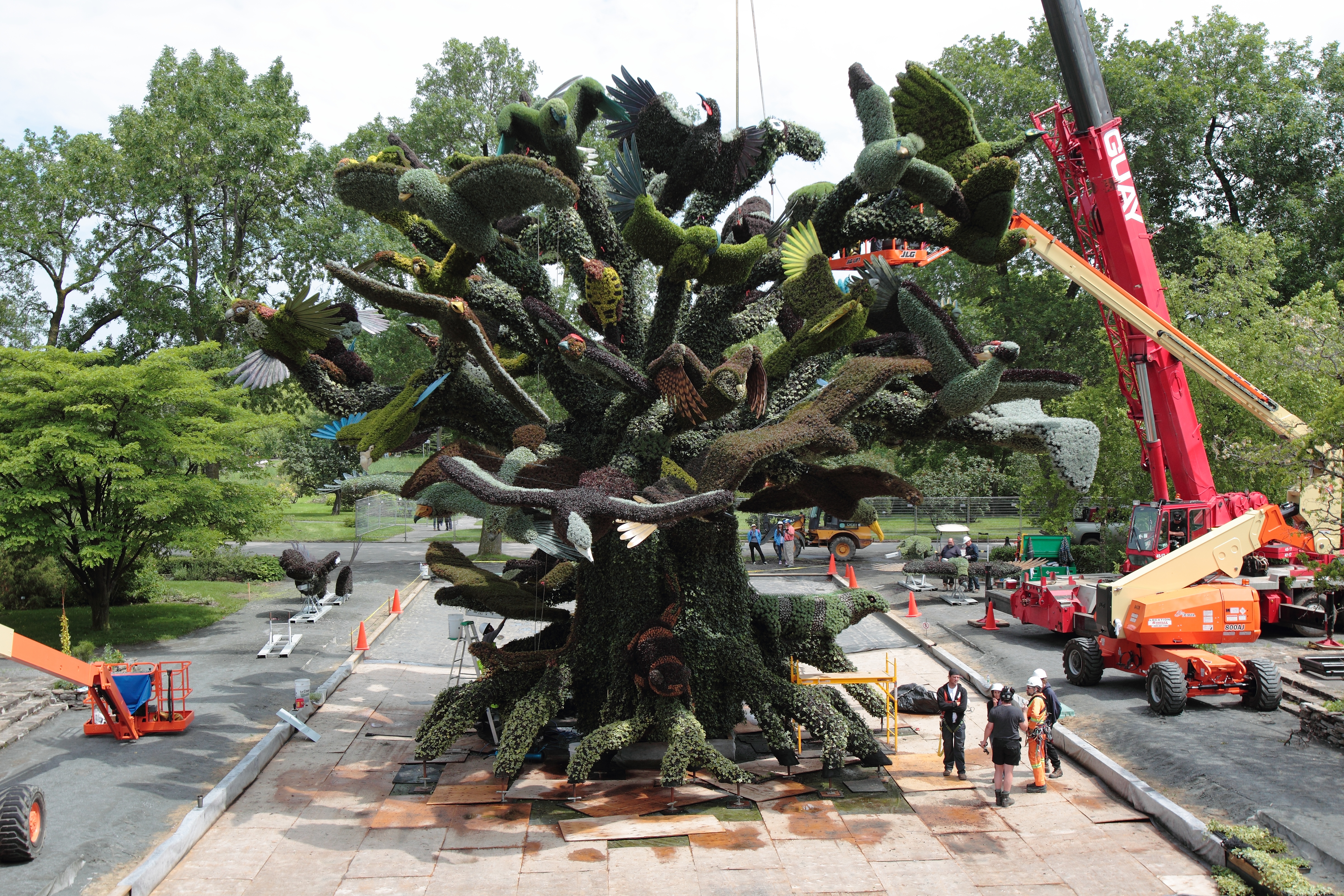 Comptant parmi l’une des plus grandes et complexes mosaïcultures du site, l’Arbre aux oiseaux est une création qui a pris 5 ans d’élaboration au comité de Mosaïcultures internationales. L’arbre est composé de 57 sortes d’oiseaux, tous inscrits sur la liste des espèces menacées. Haut de 17 mètres et pesant plus de 100 tonnes, l’oeuvre végétale représente un défi d’entretien; les horticulteurs de ce projet ont d’ailleurs été initiés aux techniques d’escalade. Il y a environ 350 000 plantes nécessaires à recouvrir l’œuvre, qui été associée à la ville de Montréal pour l’exposition. Cette structure sera terminée sous peu et trônera au cœur d’un bassin d’eau.