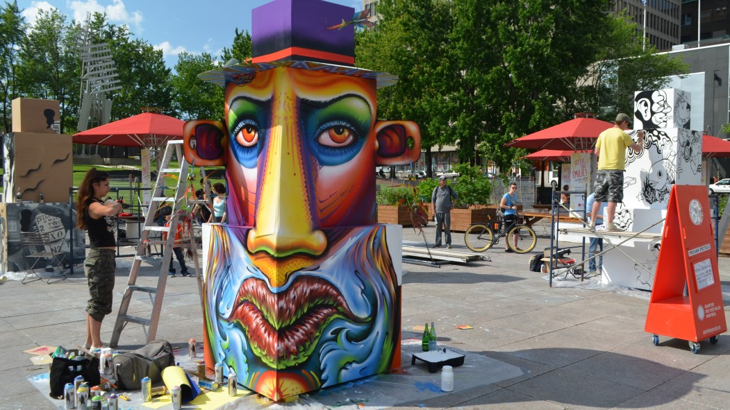 Création de Totems Urbains V2.0 place Émilie-Gamelin, au FIMA, le Festival international Montréal en arts.