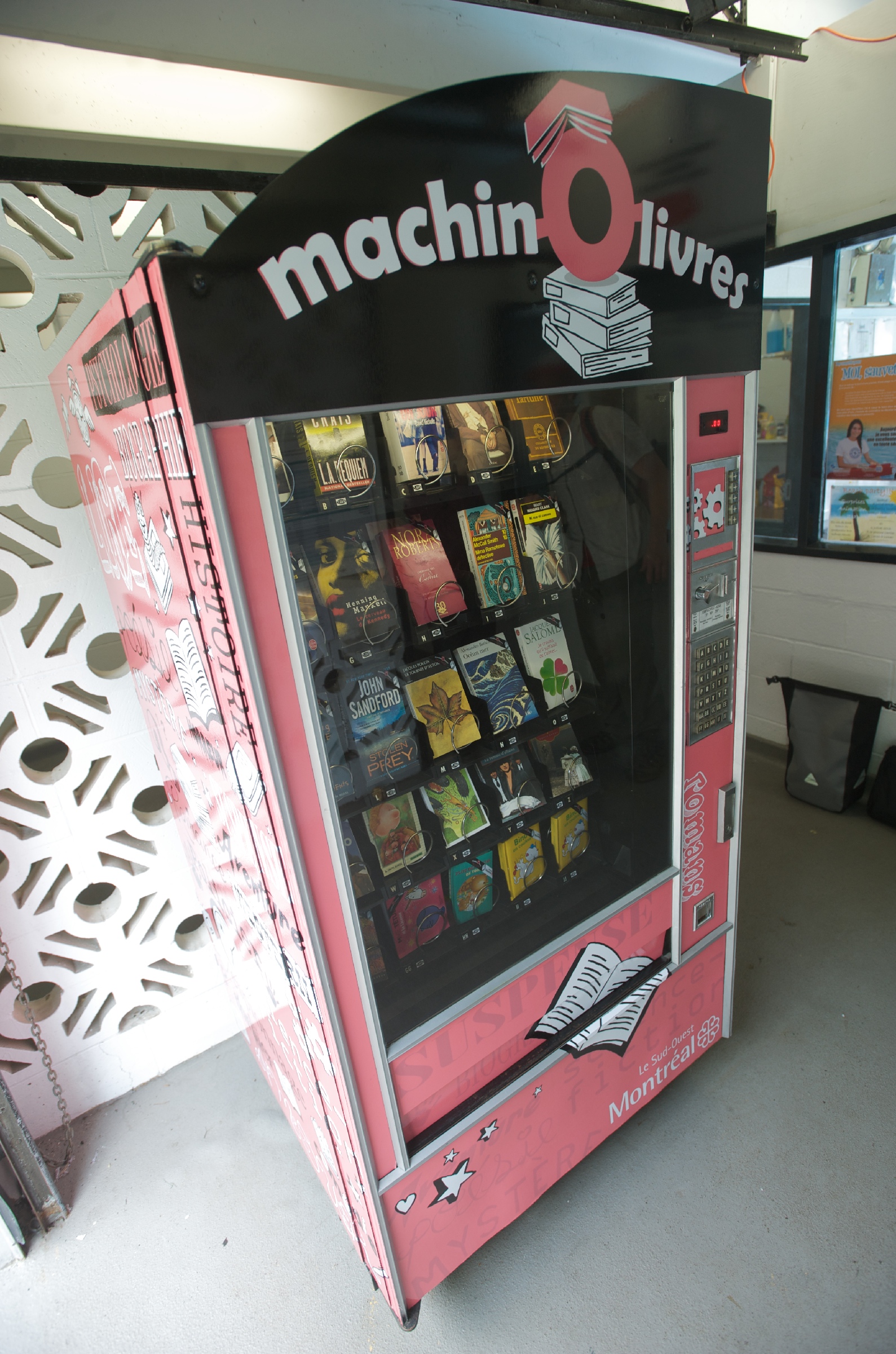 Aujourd’hui, le maire du Sud-Ouest, Benoit Dorais, présentait le Machin-Ô-Livres, un distributeur de malbouffe converti en distributeur de savoir à prix modique (1$). Ces distributrices d’un nouveau genre, qui proposeront une trentaine de titres chacune, seront déployées aux piscines du square Sir-George-Étienne-Cartier, du parc Ignace-Bourget et du complexe récréatif Gadbois.