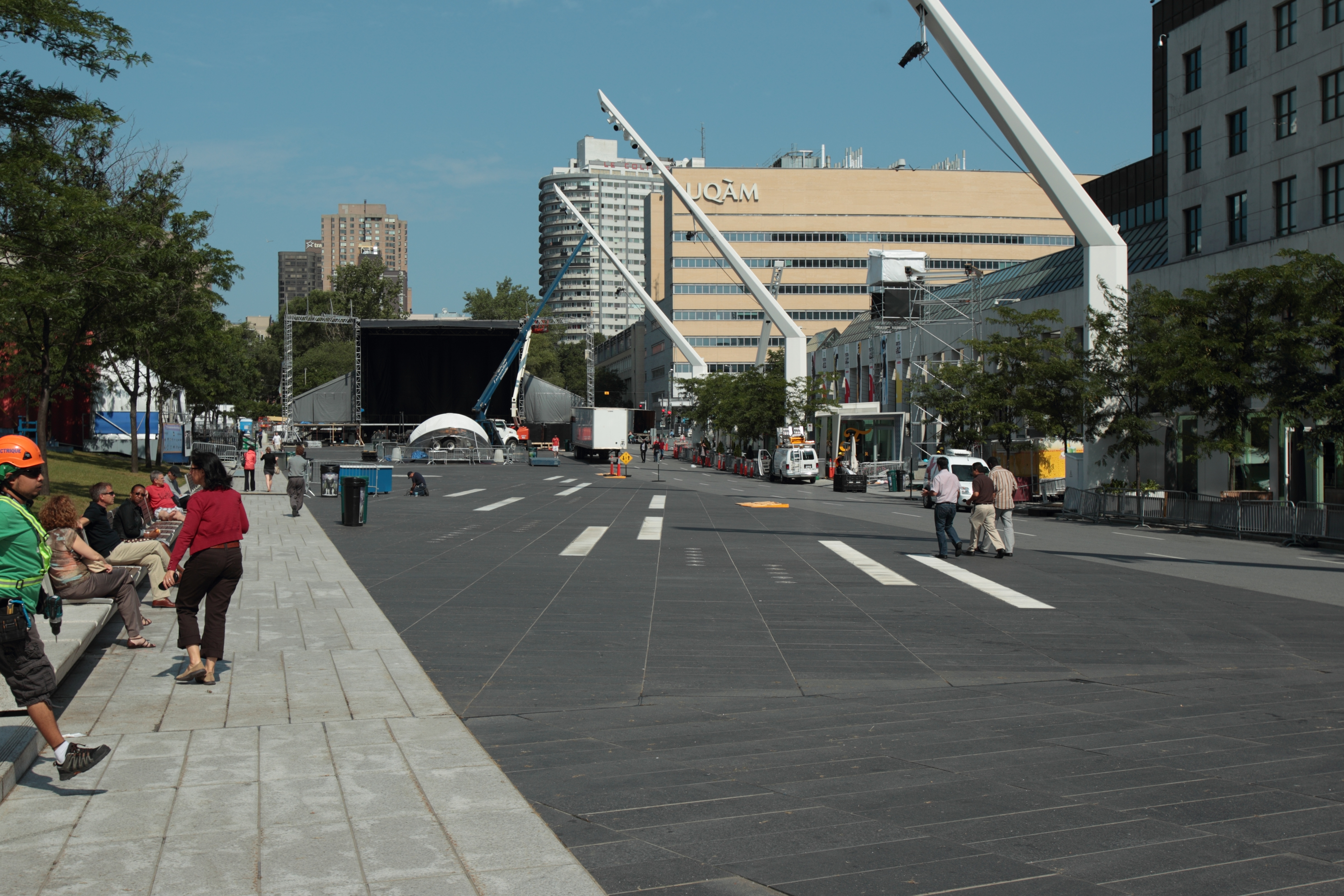 La Place des festivals est esthétique, mais elle n’a sans doute pas été conçue pour repousser la chaleur. Le noir, comme les pierres qui recouvrent une grande partie de la place, est la couleur qui absorbe le plus la chaleur. Cela est facile à constater en posant une main sur une pierre noire et une autre sur une pierre blanche, qui sera beaucoup plus fraîche. Les petits enfants qui voudront s’amuser dans les jets d’eau se brûleront donc les pieds!