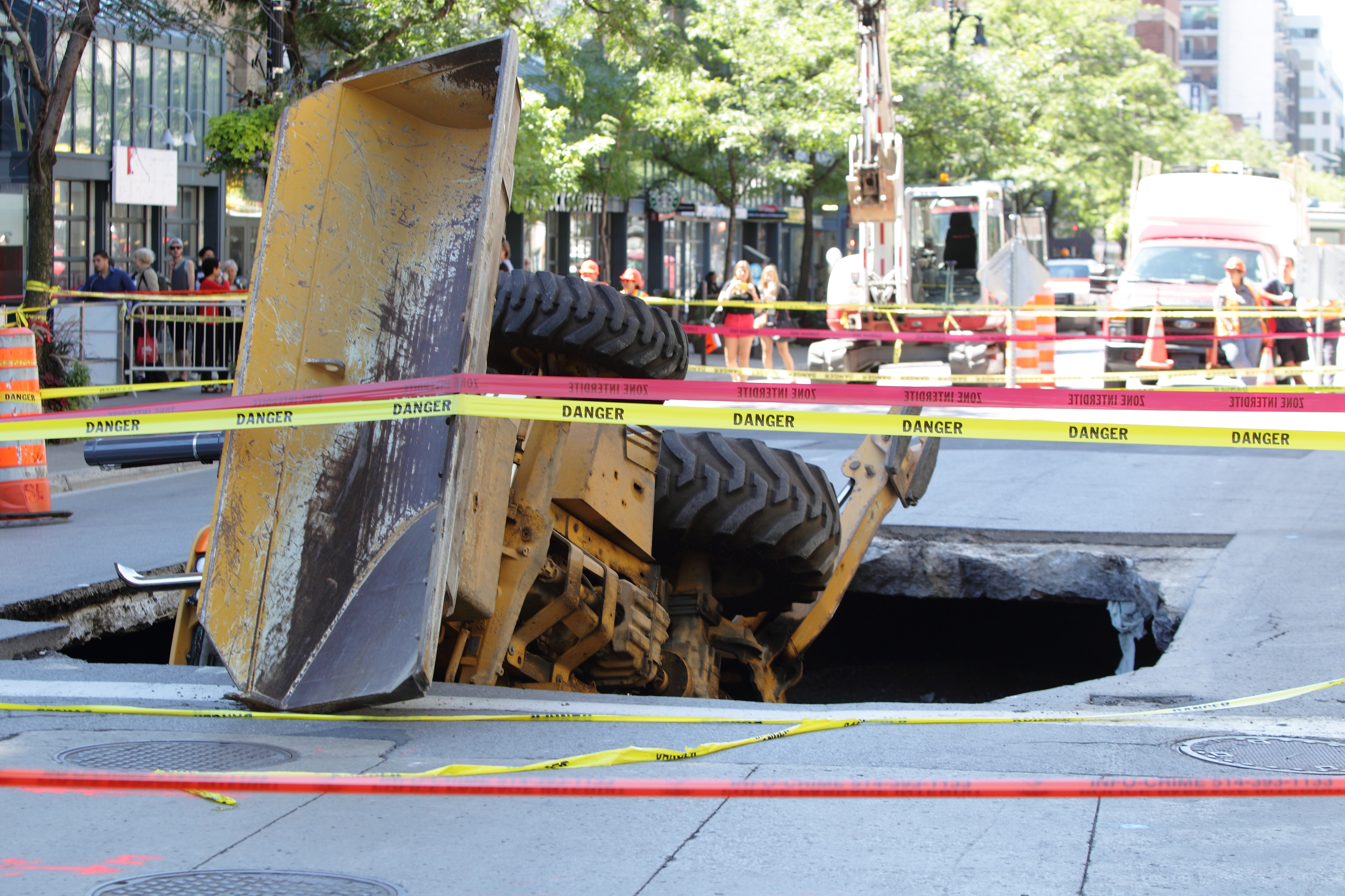 L’arrondissement de Ville-Marie étudie présentement la scène afin de déterminer si l’effondrement d’une conduite d’égout peut expliquer le spectaculaire incident.