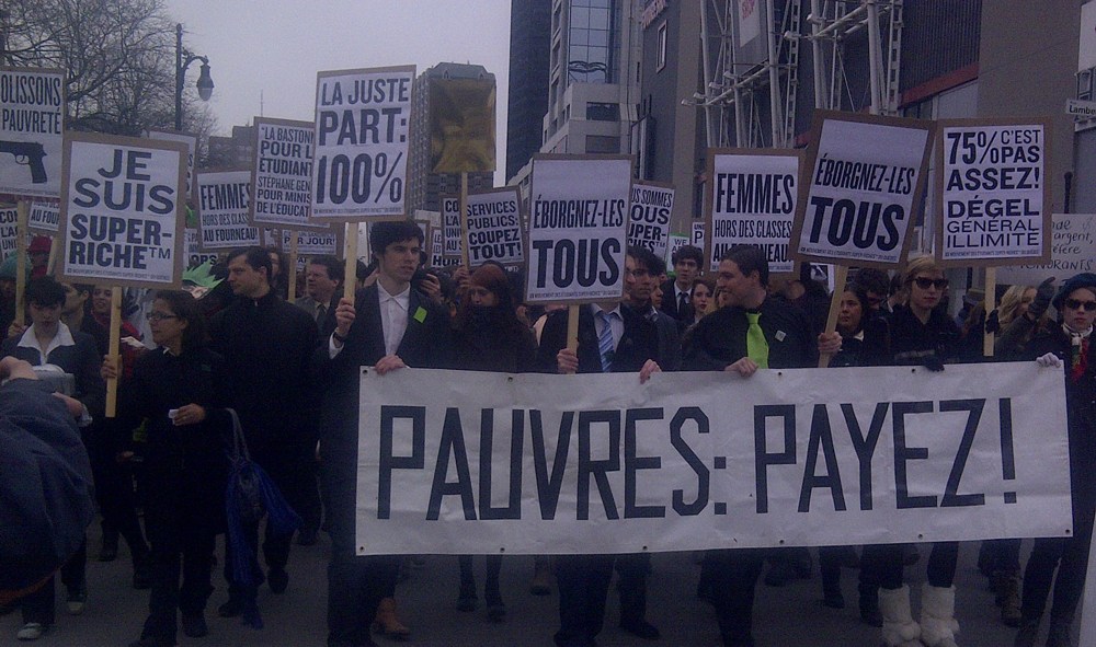 L’organisateur de l’événement, Laurent de Bellefeuille s’est dit satisfait de la participation. Il souligne que lors d’une vraie manifestation pour la hausse des frais de scolarité la semaine dernière, seulement 10 personnes se sont présentées. «Nous souhaitons pousser la logique du gouvernement Charest un peu plus loin pour démontrer les dérapages qui pourraient survenir», explique M. Bellefeuille qui complète ses études en urbanisme à l’UQAM.