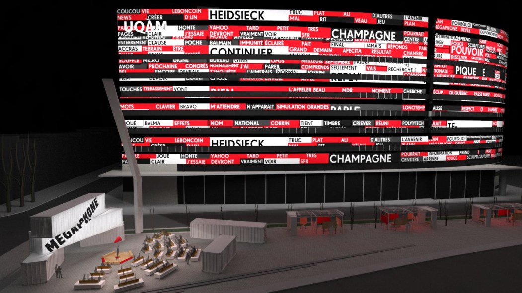 Du 4 septembre au 4 novembre, en soirée, les paroles que prononceront les citoyens dans le Mégaphone sur la promenade des artistes, au coin des rues Jeanne-Mance et De Maisonneuve, seront retransmises par le son et par l’image. À l’aide d’une technologie de reconnaissance vocale, un certain nombre des mots articulés dans le micro apparaîtront sur le mur du pavillon Président-Kennedy de l’Université du Québec à Montréal. «L’intonation dans la voix des orateurs influencera aussi les motifs et les couleurs projetées», ajoute Marie-Claude Lamoureux, relationniste à l’Office national du film du Canada, un des initiateurs du projet.
