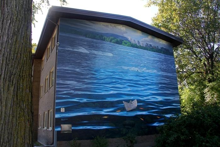 Cette murale, la septième du secteur, rend hommage à l’eau de Montréal et au génie des employés de la Ville, qui permettent de la faire courir du fleuve aux robinets.