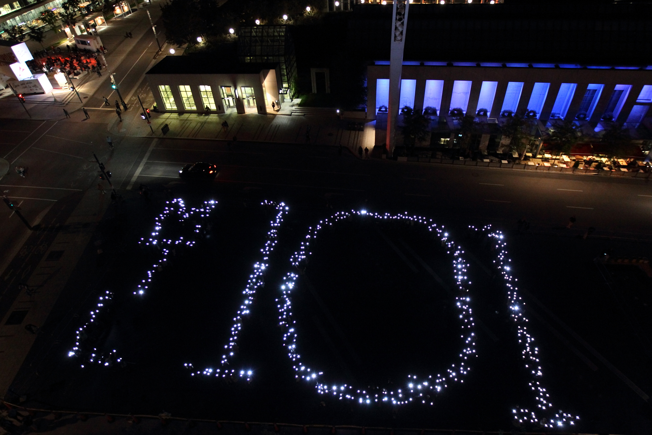 Les participants à l’événement de mercredi se sont fait remettre une lampe et ont été invités à se placer sur des pastilles qui formaient un énorme «101» sur la grande place des Festivals, à côté de la Place des Arts.