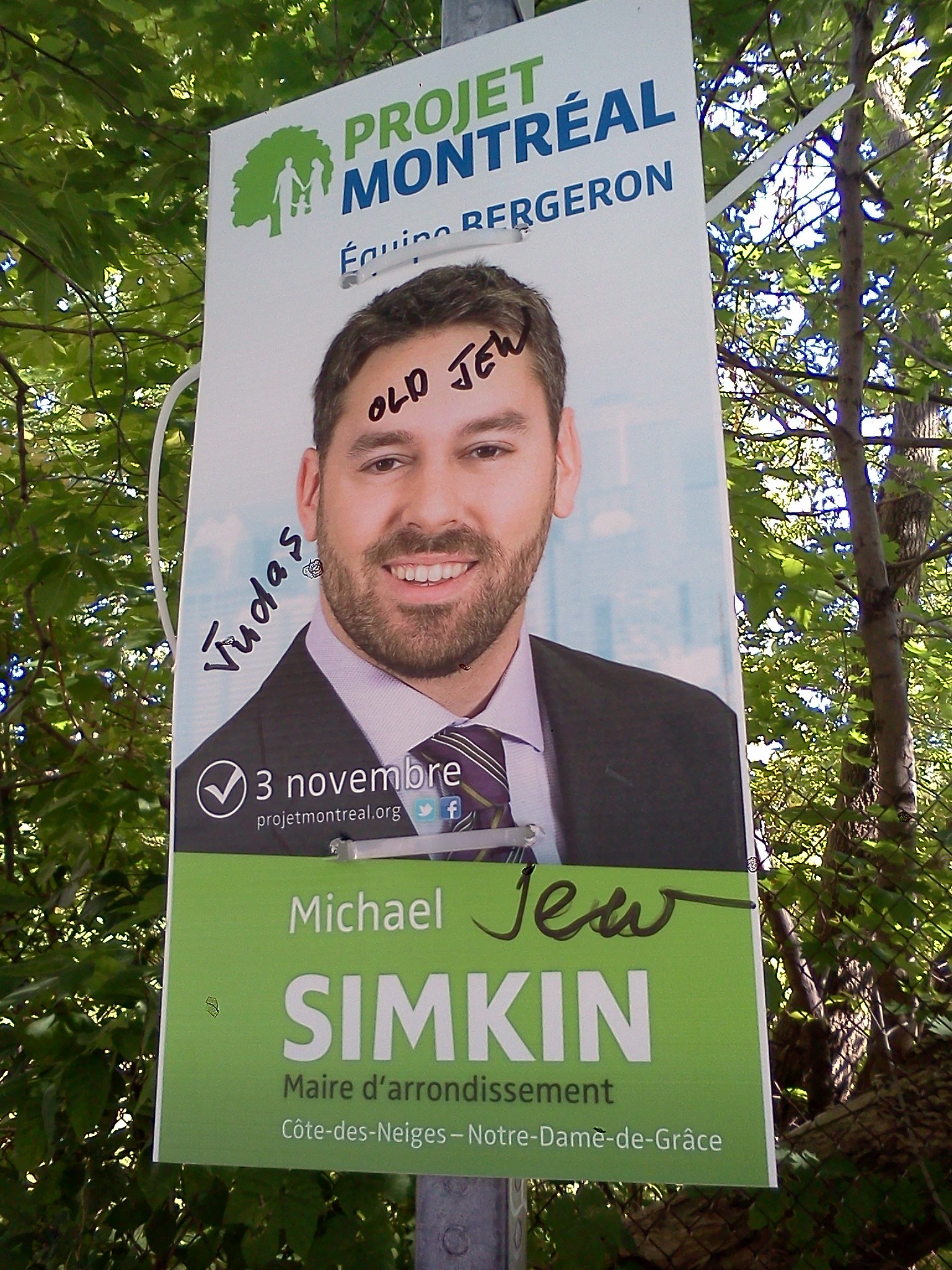 Une pancarte électorale du candidat de Projet Montréal à la mairie dans Notre-Dame-de-Grâce, Michael Simkin, a été vandalisée de graffitis antisémites, mardi.