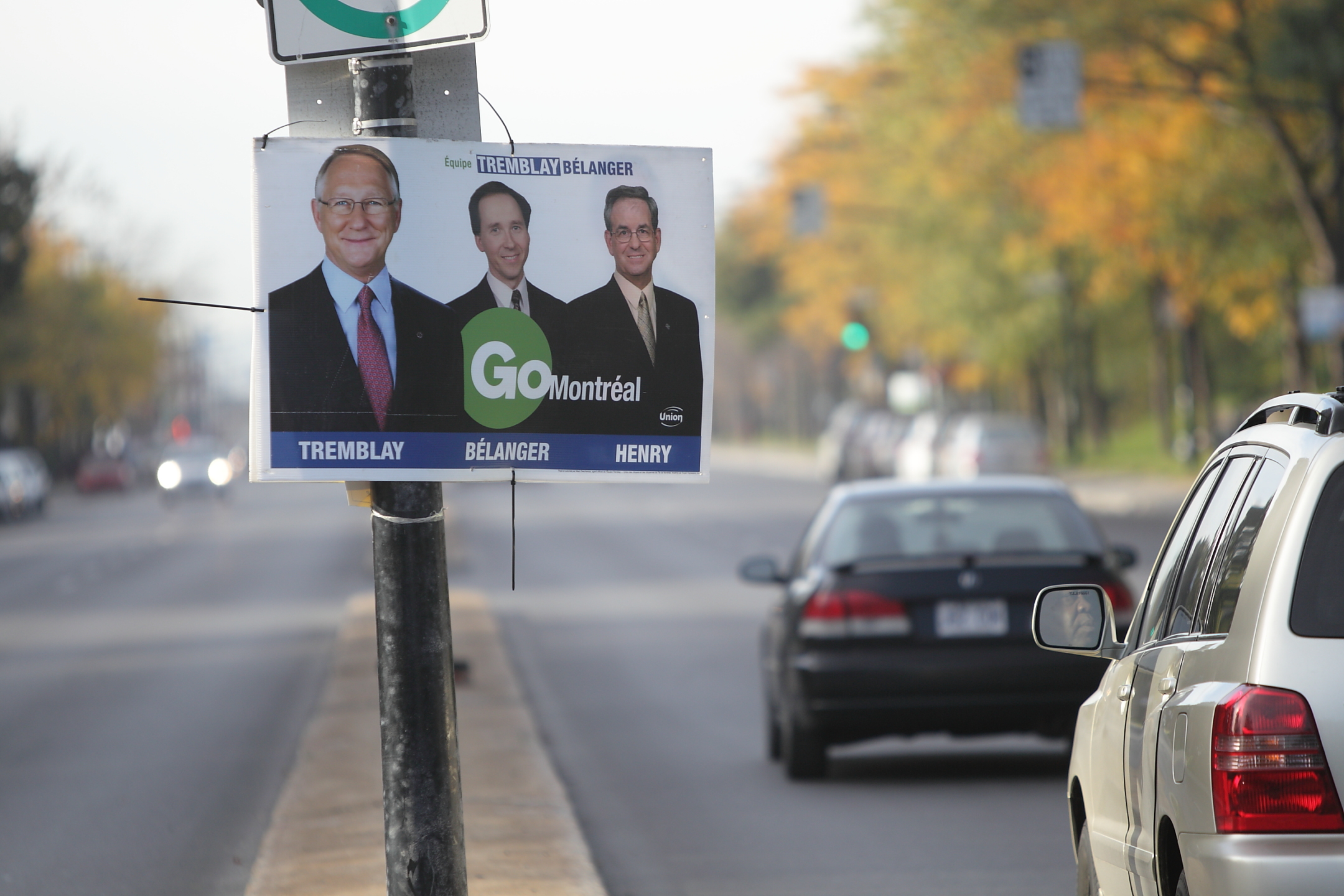 L’affiche montre un Gérald Tremblay souriant accompagné de ses candidats d’alors Pierre Bélanger, qui a depuis co-fondé l’Équipe Denis Coderre pour Montréal et qui aide toujours M. Coderre avec sa campagne, et de Marcel Henry.