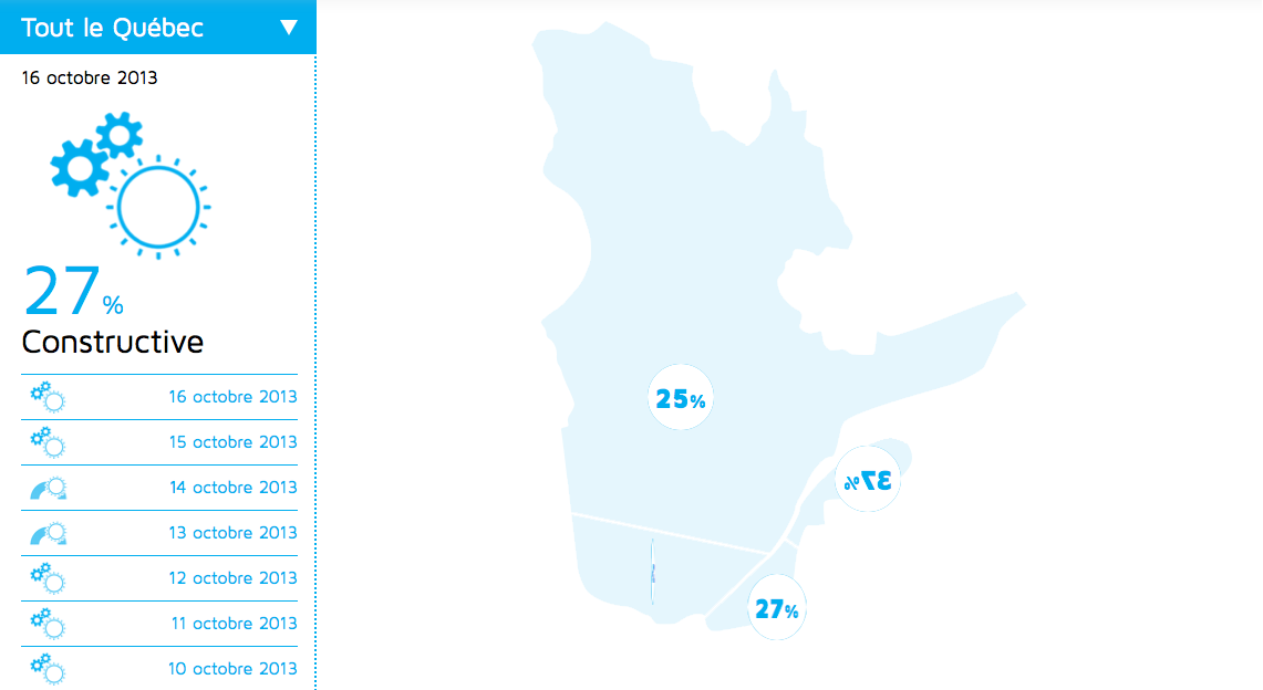 Les résultats sont ensuite publiés sur le site 6 millions de X, sous forme de «conditions météorologiques» actuelles de l’atmosphère des conversations politiques. Les usagers peuvent voir en temps réel l’évolution de l’humeur des internautes, qui réagit au gré des nouvelles. Par exemple, l’indice «cynique» a grimpé vers la fin de la semaine dernière, quand l’affaire des appels automatisés a attisé les discussions.