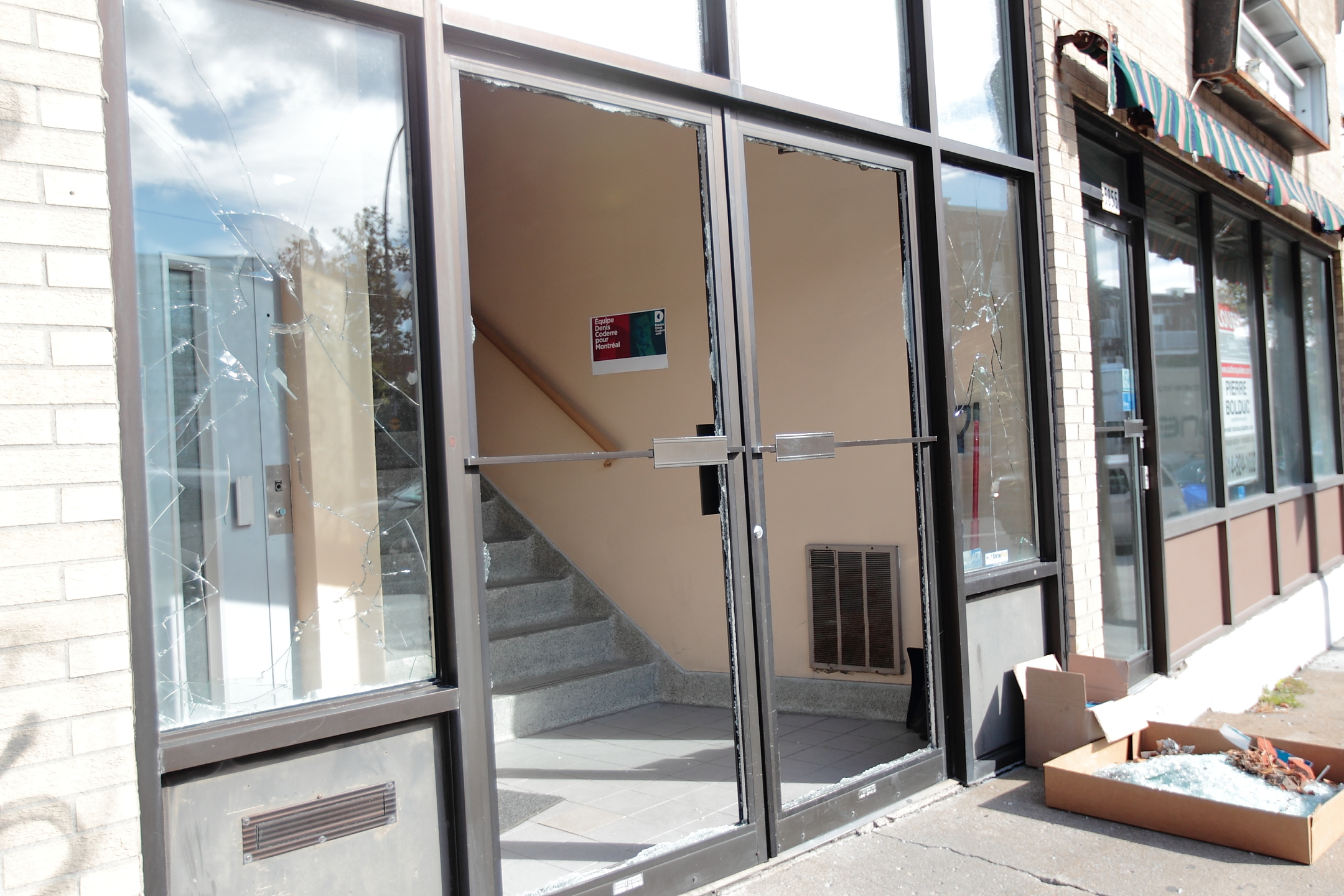 Les deux portes vitrées situées à l’avant de l’immeuble ont été fracassées par des briques et deux fenêtres, où trônaient des affiches de l’Équipe Denis Coderre, ont aussi été brisées.