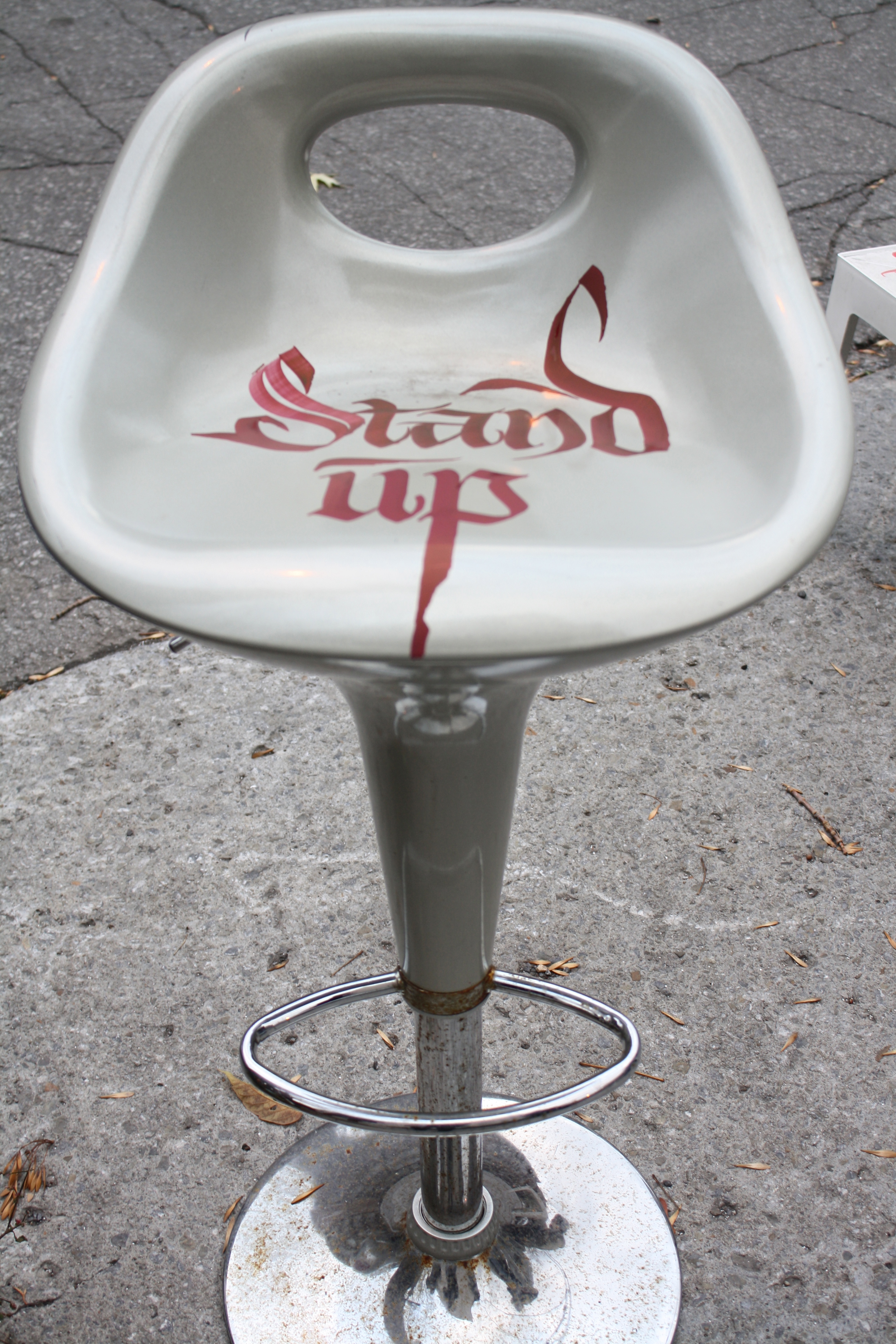 Romain sort ses feutres et s’élance. L’idée lui vient immédiatement en tête, comme un coup de cœur. Sur la couverture, au feutre blanc, il écrit «Ne me quitte pas, il faut oublier», en référence à l’aspect antique de l’objet. Penché sur le tourne-disque, minutieux, il laisse glisser son crayon avec délicatesse et fluidité, comme un artiste sur sa toile. «Normalement, il faut plus de temps pour trouver ce qu’on écrira. C’est toujours un amalgame entre l’objet, le contexte et l’endroit où il se trouve qui nous donne l’idée», affirme Olivier, qui admet que leurs messages sont d’abord des jeux de mots drôles, positifs, ludiques, et des réflexions poétiques.