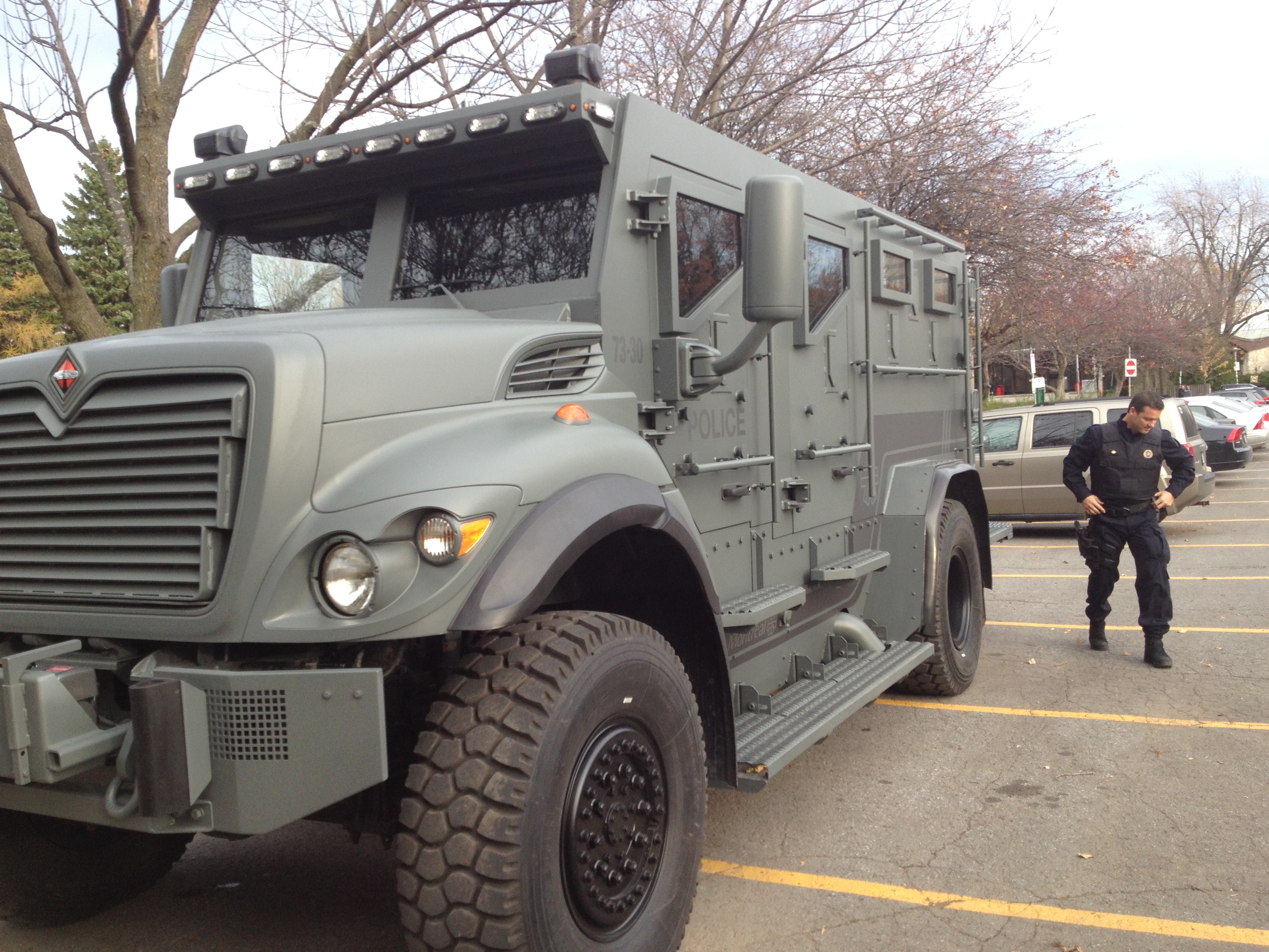 p. 30: En 1899, 56 ans après son instauration, le Service de police obtient l’achat de 100 révolvers de marque Iver Johnson. Il faut dire que se défendre avec des matraques contre des cambrioleurs qui vous tirent dessus, ce n’est pas très efficace. Près de 114 ans plus tard, le SPVM croit que les révolvers ne sont plus suffisants contre les tireurs, il lui faut un camion blindé (ci-dessous). À vous de juger s’il faut considérer cela comme une avancée…